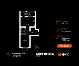 Прямая продажа от застройщика! Загородный жилой комплекс класса Комфорт Плюс.Продаётся 2-к квартира номер 97 общей площадью 43.1 кв.м на 3-м этаже 5 этажного дома. Без отделки.Особенности:- Квартира доступна к покупке в Trade-In.- Распашная планировка - отличное сочетание удобства и свободы.- Увеличенное число окон- Гибкая планировка - создайте пространство по своему вкусу.- Евроформат - просторное и удобное жилье с отличной планировкой.- Ниша под шкаф - компактное и удобное место для вещей.- Лоджия - уютное место для отдыха и тишины.- Вид из окна: двор- Вид из окна: улицаКвартира без отделки. Чистый холст для воплощения интерьера вашей мечты.Расположение комплекса: ''Апрелевка Клаб'' - это жилой комплекс всего в 30 км от Москвы по Киевскому шоссе, где городские удобства гармонично сочетаются с природой. Здесь начинается новая ступень жизни: современная малоэтажная застройка не нарушает живописные виды, а закрытая территория дарит чувство безопасности.Транспортная доступность:- Метро Филатов Луг и Рассказовка - 25 км- МЦД Апрелевка - 5 км - МКАД — 30 км- Садовое кольцо — 45 км- Метро в Троицке (открытие в 2030) — 22 км- Ближайшая остановка общ. транспорта ''Фрунзевец'' - 550 м- Ст. м. ''Саларьево'' - 30 мин. на автобусеВнутренняя инфраструктура:Здесь есть хобби на любой вкус, возраст и сезон. Велосипедные, беговые и прогулочные маршруты, уличный workout, летний амфитеатр, спортивная площадка, центральная площадь с сухим фонтаном и игровыми зонами. Крытые развлечения: зона коворкинга, детская комната, кафе.В жилом комплексе будет современная школа на 830 мест и детский сад на 400 мест нового формата: с просторными классами и современным оснащением согласно высоким стандартам. Также на территории будет размещена школа искусств.Дворы без машин, игровые зоны и маршруты для прогулок с навигацией минимизируют риски и создают ощущение защищенности.Вдоль южной границы комплекса протекает река Десна, создавая зону отдыха в природном окружении. Цены указаны с учетом скидки.