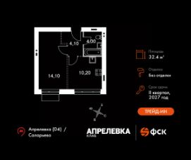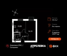 Прямая продажа от застройщика! Загородный жилой комплекс класса Комфорт Плюс.Продаётся 1-к квартира номер 81 общей площадью 32.4 кв.м на 4-м этаже 5 этажного дома. Без отделки.Особенности:- Квартира доступна к покупке в Trade-In.- Линейная планировка - максимальная функциональность и удобство.- Гибкая планировка - создайте пространство по своему вкусу.- Стандартное количество квартир на этаже - оптимальный выбор для городской жизни.- Ниша под шкаф - компактное и удобное место для вещей.- Вид из окна на соседний корпусКвартира без отделки. Чистый холст для воплощения интерьера вашей мечты.Расположение комплекса: ''Апрелевка Клаб'' - это жилой комплекс всего в 30 км от Москвы по Киевскому шоссе, где городские удобства гармонично сочетаются с природой. Здесь начинается новая ступень жизни: современная малоэтажная застройка не нарушает живописные виды, а закрытая территория дарит чувство безопасности.Транспортная доступность:- Метро Филатов Луг и Рассказовка - 25 км- МЦД Апрелевка - 5 км - МКАД — 30 км- Садовое кольцо — 45 км- Метро в Троицке (открытие в 2030) — 22 км- Ближайшая остановка общ. транспорта ''Фрунзевец'' - 550 м- Ст. м. ''Саларьево'' - 30 мин. на автобусеВнутренняя инфраструктура:Здесь есть хобби на любой вкус, возраст и сезон. Велосипедные, беговые и прогулочные маршруты, уличный workout, летний амфитеатр, спортивная площадка, центральная площадь с сухим фонтаном и игровыми зонами. Крытые развлечения: зона коворкинга, детская комната, кафе.В жилом комплексе будет современная школа на 830 мест и детский сад на 400 мест нового формата: с просторными классами и современным оснащением согласно высоким стандартам. Также на территории будет размещена школа искусств.Дворы без машин, игровые зоны и маршруты для прогулок с навигацией минимизируют риски и создают ощущение защищенности.Вдоль южной границы комплекса протекает река Десна, создавая зону отдыха в природном окружении. Цены указаны с учетом скидки.