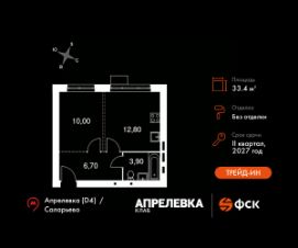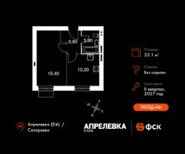 Прямая продажа от застройщика! Загородный жилой комплекс класса Комфорт Плюс.Продаётся 1-к квартира номер 55 общей площадью 33.4 кв.м на 4-м этаже 5 этажного дома. Без отделки.Особенности:- Квартира доступна к покупке в Trade-In.- Линейная планировка - максимальная функциональность и удобство.- Гибкая планировка - создайте пространство по своему вкусу.- Стандартное количество квартир на этаже - оптимальный выбор для городской жизни.- Вид из окна на соседний корпусКвартира без отделки. Чистый холст для воплощения интерьера вашей мечты.Расположение комплекса: ''Апрелевка Клаб'' - это жилой комплекс всего в 30 км от Москвы по Киевскому шоссе, где городские удобства гармонично сочетаются с природой. Здесь начинается новая ступень жизни: современная малоэтажная застройка не нарушает живописные виды, а закрытая территория дарит чувство безопасности.Транспортная доступность:- Метро Филатов Луг и Рассказовка - 25 км- МЦД Апрелевка - 5 км - МКАД — 30 км- Садовое кольцо — 45 км- Метро в Троицке (открытие в 2030) — 22 км- Ближайшая остановка общ. транспорта ''Фрунзевец'' - 550 м- Ст. м. ''Саларьево'' - 30 мин. на автобусеВнутренняя инфраструктура:Здесь есть хобби на любой вкус, возраст и сезон. Велосипедные, беговые и прогулочные маршруты, уличный workout, летний амфитеатр, спортивная площадка, центральная площадь с сухим фонтаном и игровыми зонами. Крытые развлечения: зона коворкинга, детская комната, кафе.В жилом комплексе будет современная школа на 830 мест и детский сад на 400 мест нового формата: с просторными классами и современным оснащением согласно высоким стандартам. Также на территории будет размещена школа искусств.Дворы без машин, игровые зоны и маршруты для прогулок с навигацией минимизируют риски и создают ощущение защищенности.Вдоль южной границы комплекса протекает река Десна, создавая зону отдыха в природном окружении. Цены указаны с учетом скидки.