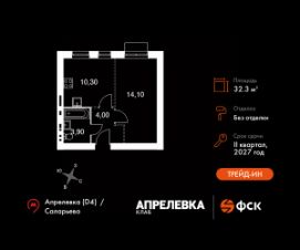 Прямая продажа от застройщика! Загородный жилой комплекс класса Комфорт Плюс.Продаётся 1-к квартира номер 38 общей площадью 32.3 кв.м на 2-м этаже 5 этажного дома. Без отделки.Особенности:- Квартира доступна к покупке в Trade-In.- Линейная планировка - максимальная функциональность и удобство.- Можно оборудовать рабочее место - комфорт для работы и учёбы.- Гибкая планировка - создайте пространство по своему вкусу.- Стандартное количество квартир на этаже - оптимальный выбор для городской жизни.- Ниша под шкаф - компактное и удобное место для вещей.- Вид из окна на соседний корпусКвартира без отделки. Чистый холст для воплощения интерьера вашей мечты.Расположение комплекса: ''Апрелевка Клаб'' - это жилой комплекс всего в 30 км от Москвы по Киевскому шоссе, где городские удобства гармонично сочетаются с природой. Здесь начинается новая ступень жизни: современная малоэтажная застройка не нарушает живописные виды, а закрытая территория дарит чувство безопасности.Транспортная доступность:- Метро Филатов Луг и Рассказовка - 25 км- МЦД Апрелевка - 5 км - МКАД — 30 км- Садовое кольцо — 45 км- Метро в Троицке (открытие в 2030) — 22 км- Ближайшая остановка общ. транспорта ''Фрунзевец'' - 550 м- Ст. м. ''Саларьево'' - 30 мин. на автобусеВнутренняя инфраструктура:Здесь есть хобби на любой вкус, возраст и сезон. Велосипедные, беговые и прогулочные маршруты, уличный workout, летний амфитеатр, спортивная площадка, центральная площадь с сухим фонтаном и игровыми зонами. Крытые развлечения: зона коворкинга, детская комната, кафе.В жилом комплексе будет современная школа на 830 мест и детский сад на 400 мест нового формата: с просторными классами и современным оснащением согласно высоким стандартам. Также на территории будет размещена школа искусств.Дворы без машин, игровые зоны и маршруты для прогулок с навигацией минимизируют риски и создают ощущение защищенности.Вдоль южной границы комплекса протекает река Десна, создавая зону отдыха в природном окружении. Цены указаны с учетом скидки.