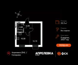 Прямая продажа от застройщика! Загородный жилой комплекс класса Комфорт Плюс.Продаётся 1-к квартира номер 46 общей площадью 32.3 кв.м на 3-м этаже 5 этажного дома. Без отделки.Особенности:- Квартира доступна к покупке в Trade-In.- Линейная планировка - максимальная функциональность и удобство.- Можно оборудовать рабочее место - комфорт для работы и учёбы.- Гибкая планировка - создайте пространство по своему вкусу.- Стандартное количество квартир на этаже - оптимальный выбор для городской жизни.- Ниша под шкаф - компактное и удобное место для вещей.- Вид из окна на соседний корпусКвартира без отделки. Чистый холст для воплощения интерьера вашей мечты.Расположение комплекса: ''Апрелевка Клаб'' - это жилой комплекс всего в 30 км от Москвы по Киевскому шоссе, где городские удобства гармонично сочетаются с природой. Здесь начинается новая ступень жизни: современная малоэтажная застройка не нарушает живописные виды, а закрытая территория дарит чувство безопасности.Транспортная доступность:- Метро Филатов Луг и Рассказовка - 25 км- МЦД Апрелевка - 5 км - МКАД — 30 км- Садовое кольцо — 45 км- Метро в Троицке (открытие в 2030) — 22 км- Ближайшая остановка общ. транспорта ''Фрунзевец'' - 550 м- Ст. м. ''Саларьево'' - 30 мин. на автобусеВнутренняя инфраструктура:Здесь есть хобби на любой вкус, возраст и сезон. Велосипедные, беговые и прогулочные маршруты, уличный workout, летний амфитеатр, спортивная площадка, центральная площадь с сухим фонтаном и игровыми зонами. Крытые развлечения: зона коворкинга, детская комната, кафе.В жилом комплексе будет современная школа на 830 мест и детский сад на 400 мест нового формата: с просторными классами и современным оснащением согласно высоким стандартам. Также на территории будет размещена школа искусств.Дворы без машин, игровые зоны и маршруты для прогулок с навигацией минимизируют риски и создают ощущение защищенности.Вдоль южной границы комплекса протекает река Десна, создавая зону отдыха в природном окружении. Цены указаны с учетом скидки.