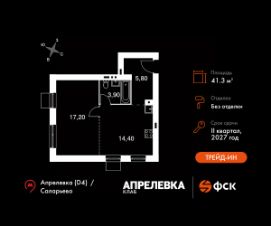 Прямая продажа от застройщика! Загородный жилой комплекс класса Комфорт Плюс.Продаётся 1-к квартира номер 20 общей площадью 41.3 кв.м на 4-м этаже 5 этажного дома. Без отделки.Особенности:- Квартира доступна к покупке в Trade-In.- Угловая планировка - больше пространства для ваших идей.- Увеличенное число окон- Можно оборудовать рабочее место - комфорт для работы и учёбы.- Гибкая планировка - создайте пространство по своему вкусу.- Проходная кухня-гостиная - идеальное пространство для общения и готовки.- Стандартное количество квартир на этаже - оптимальный выбор для городской жизни.- Ниша под шкаф - компактное и удобное место для вещей.- Вид из окна на соседний корпус- Вид из окна: парковкаКвартира без отделки. Чистый холст для воплощения интерьера вашей мечты.Расположение комплекса: ''Апрелевка Клаб'' - это жилой комплекс всего в 30 км от Москвы по Киевскому шоссе, где городские удобства гармонично сочетаются с природой. Здесь начинается новая ступень жизни: современная малоэтажная застройка не нарушает живописные виды, а закрытая территория дарит чувство безопасности.Транспортная доступность:- Метро Филатов Луг и Рассказовка - 25 км- МЦД Апрелевка - 5 км - МКАД — 30 км- Садовое кольцо — 45 км- Метро в Троицке (открытие в 2030) — 22 км- Ближайшая остановка общ. транспорта ''Фрунзевец'' - 550 м- Ст. м. ''Саларьево'' - 30 мин. на автобусеВнутренняя инфраструктура:Здесь есть хобби на любой вкус, возраст и сезон. Велосипедные, беговые и прогулочные маршруты, уличный workout, летний амфитеатр, спортивная площадка, центральная площадь с сухим фонтаном и игровыми зонами. Крытые развлечения: зона коворкинга, детская комната, кафе.В жилом комплексе будет современная школа на 830 мест и детский сад на 400 мест нового формата: с просторными классами и современным оснащением согласно высоким стандартам. Также на территории будет размещена школа искусств.Дворы без машин, игровые зоны и маршруты для прогулок с навигацией минимизируют риски и создают ощущение защищенности.Вдоль южной границы комплекса протекает река Десна, создавая зону отдыха в природном окружении. Цены указаны с учетом скидки.