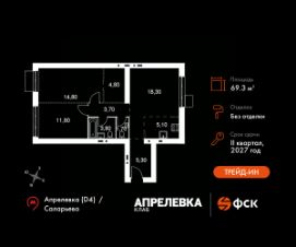 Прямая продажа от застройщика! Загородный жилой комплекс класса Комфорт Плюс.Продаётся 3-к квартира номер 182 общей площадью 69.3 кв.м на 3-м этаже 5 этажного дома. Без отделки.Особенности:- Квартира доступна к покупке в Trade-In.- Мастер-зона с гардеробной. Просторное место для отдыха и удобного хранения вещей.- Распашная планировка - отличное сочетание удобства и свободы.- Раздельный санузел- Можно оборудовать рабочее место - комфорт для работы и учёбы.- Гибкая планировка - создайте пространство по своему вкусу.- Евроформат - просторное и удобное жилье с отличной планировкой.- Просторная мягкая зона - комфорт и уют для отдыха всей семьи.- Стандартное количество квартир на этаже - оптимальный выбор для городской жизни.- Гардеробная - удобство для хранения и организации вещей.- Вид из окна: двор- Вид из окна: парковкаКвартира без отделки. Чистый холст для воплощения интерьера вашей мечты.Расположение комплекса: ''Апрелевка Клаб'' - это жилой комплекс всего в 30 км от Москвы по Киевскому шоссе, где городские удобства гармонично сочетаются с природой. Здесь начинается новая ступень жизни: современная малоэтажная застройка не нарушает живописные виды, а закрытая территория дарит чувство безопасности.Транспортная доступность:- Метро Филатов Луг и Рассказовка - 25 км- МЦД Апрелевка - 5 км - МКАД — 30 км- Садовое кольцо — 45 км- Метро в Троицке (открытие в 2030) — 22 км- Ближайшая остановка общ. транспорта ''Фрунзевец'' - 550 м- Ст. м. ''Саларьево'' - 30 мин. на автобусеВнутренняя инфраструктура:Здесь есть хобби на любой вкус, возраст и сезон. Велосипедные, беговые и прогулочные маршруты, уличный workout, летний амфитеатр, спортивная площадка, центральная площадь с сухим фонтаном и игровыми зонами. Крытые развлечения: зона коворкинга, детская комната, кафе.В жилом комплексе будет современная школа на 830 мест и детский сад на 400 мест нового формата: с просторными классами и современным оснащением согласно высоким стандартам. Также на территории будет размещена школа искусств.Дворы без машин, игровые зоны и маршруты для прогулок с навигацией минимизируют риски и создают ощущение защищенности.Вдоль южной границы комплекса протекает река Десна, создавая зону отдыха в природном окружении. Цены указаны с учетом скидки.