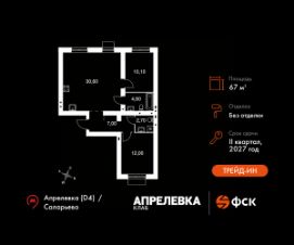Прямая продажа от застройщика! Загородный жилой комплекс класса Комфорт Плюс.Продаётся 3-к квартира номер 198 общей площадью 67 кв.м на 2-м этаже 5 этажного дома. Без отделки.Особенности:- Квартира доступна к покупке в Trade-In.- Распашная планировка - отличное сочетание удобства и свободы.- Увеличенное число окон- Раздельный санузел- Гибкая планировка - создайте пространство по своему вкусу.- Евроформат - просторное и удобное жилье с отличной планировкой.- Просторная мягкая зона - комфорт и уют для отдыха всей семьи.- Проходная кухня-гостиная - идеальное пространство для общения и готовки.- Ограниченное количество квартир на этаже - комфорт и уют без лишней суеты.- Ниша под шкаф - компактное и удобное место для вещей.- Вид из окна: двор- Вид из окна: парковкаКвартира без отделки. Чистый холст для воплощения интерьера вашей мечты.Расположение комплекса: ''Апрелевка Клаб'' - это жилой комплекс всего в 30 км от Москвы по Киевскому шоссе, где городские удобства гармонично сочетаются с природой. Здесь начинается новая ступень жизни: современная малоэтажная застройка не нарушает живописные виды, а закрытая территория дарит чувство безопасности.Транспортная доступность:- Метро Филатов Луг и Рассказовка - 25 км- МЦД Апрелевка - 5 км - МКАД — 30 км- Садовое кольцо — 45 км- Метро в Троицке (открытие в 2030) — 22 км- Ближайшая остановка общ. транспорта ''Фрунзевец'' - 550 м- Ст. м. ''Саларьево'' - 30 мин. на автобусеВнутренняя инфраструктура:Здесь есть хобби на любой вкус, возраст и сезон. Велосипедные, беговые и прогулочные маршруты, уличный workout, летний амфитеатр, спортивная площадка, центральная площадь с сухим фонтаном и игровыми зонами. Крытые развлечения: зона коворкинга, детская комната, кафе.В жилом комплексе будет современная школа на 830 мест и детский сад на 400 мест нового формата: с просторными классами и современным оснащением согласно высоким стандартам. Также на территории будет размещена школа искусств.Дворы без машин, игровые зоны и маршруты для прогулок с навигацией минимизируют риски и создают ощущение защищенности.Вдоль южной границы комплекса протекает река Десна, создавая зону отдыха в природном окружении. Цены указаны с учетом скидки.