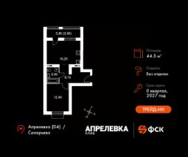Прямая продажа от застройщика! Загородный жилой комплекс класса Комфорт Плюс.Продаётся 2-к квартира номер 205 общей площадью 44.5 кв.м на 3-м этаже 5 этажного дома. Без отделки.Особенности:- Квартира доступна к покупке в Trade-In.- Распашная планировка - отличное сочетание удобства и свободы.- Увеличенное число окон- Гибкая планировка - создайте пространство по своему вкусу.- Евроформат - просторное и удобное жилье с отличной планировкой.- Ограниченное количество квартир на этаже - комфорт и уют без лишней суеты.- Ниша под шкаф - компактное и удобное место для вещей.- Лоджия - уютное место для отдыха и тишины.- Вид из окна: двор- Вид из окна: парковкаКвартира без отделки. Чистый холст для воплощения интерьера вашей мечты.Расположение комплекса: ''Апрелевка Клаб'' - это жилой комплекс всего в 30 км от Москвы по Киевскому шоссе, где городские удобства гармонично сочетаются с природой. Здесь начинается новая ступень жизни: современная малоэтажная застройка не нарушает живописные виды, а закрытая территория дарит чувство безопасности.Транспортная доступность:- Метро Филатов Луг и Рассказовка - 25 км- МЦД Апрелевка - 5 км - МКАД — 30 км- Садовое кольцо — 45 км- Метро в Троицке (открытие в 2030) — 22 км- Ближайшая остановка общ. транспорта ''Фрунзевец'' - 550 м- Ст. м. ''Саларьево'' - 30 мин. на автобусеВнутренняя инфраструктура:Здесь есть хобби на любой вкус, возраст и сезон. Велосипедные, беговые и прогулочные маршруты, уличный workout, летний амфитеатр, спортивная площадка, центральная площадь с сухим фонтаном и игровыми зонами. Крытые развлечения: зона коворкинга, детская комната, кафе.В жилом комплексе будет современная школа на 830 мест и детский сад на 400 мест нового формата: с просторными классами и современным оснащением согласно высоким стандартам. Также на территории будет размещена школа искусств.Дворы без машин, игровые зоны и маршруты для прогулок с навигацией минимизируют риски и создают ощущение защищенности.Вдоль южной границы комплекса протекает река Десна, создавая зону отдыха в природном окружении. Цены указаны с учетом скидки.