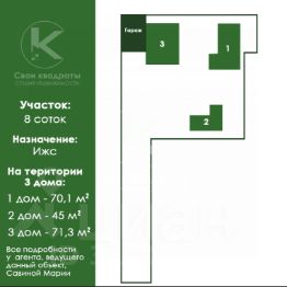 Арт. 108073327 Вашему вниманию представляется уникальный проект.Данный объект подойдет для тех, кто хочет жить рядом с родственниками, но не желает делить свой быт с ними. На территории участка 8 сот располагается три строения. ДОМ 1 Площадь 70,1 кв. м.Отопление магистральный газ (отдельный счетчик)Электричество 15кВт (отдельный счетчик)Центральная канализация Центральное водоснабжение ДОМ 2 Площадь 45 кв. м. Отопление магистральный газ (отдельный счетчик)Электричество 15кВт (отдельный счетчик)Центральная канализация Центральное водоснабжение ДОМ 3 Площадь 71,3 кв. м. Отопление магистральный газ Электричество 15кВтЦентральная канализация Центральное водоснабжение ИНФРАСТРУКТУРА В непосредственной близости вся инфраструктура г. Апрелевка и п. Селятино: дворец Культуры и Спорта, торговые центры, кинотеатры, фитнес центры, поликлиники, школы, детские сады, сетевые магазины и многое другое.В шаговой доступности школа. В 10 минутах ходьбы ж/д станция и МЦД-4. В шаговой доступности остановка общественного транспорта. За 30 минут можно доехать до ближайшего метро.Станция м. Саларьево в 30 мин на автомобиле. Все документы готовы к быстром выходу на сделку.Если Вам необходимо реализовать свою недвижимость, мы на максимально выгодных условиях совместно это сможем сделать! Данным объектом занимается Агент Савина Мария, она лично была на объекте и ответит на все оставшиеся вопросы.