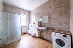 ID_501523 Преимущества: Новый дом с отделкой ''под ключ'' 4 спальни Все центральные коммуникации заведены в дом Тупиковая улица Парковка на 2 автомобиля Дом: Загородный дом площадью 200 м2 под ключ, построенный в 2021 году, представляет собой идеальный вариант для комфортного проживания в пределах Московской области. Дом оснащен всей необходимой техникой, а также обладает современными технологиями строительства и высококачественными материалами.Фундамент дома выполнен как монолитная плита, что обеспечивает его прочность и долговечность. Стены из газоблока обладают отличной теплоизоляцией, что позволяет сохранять тепло внутри помещения в холодный период и поддерживать приятную температуру в жаркую погоду. Отделка декоративной штукатуркой придает дому элегантный и современный вид.Для удобства перемещения между этажами в доме установлена монолитная лестница. Перекрытия также выполнены в виде монолитных плит, что придает дополнительную прочность и надежность. Крыша дома покрыта металлочерепицей, что не только украшает внешний вид, но и обеспечивает надежную защиту от неблагоприятных погодных условий.Окна в доме двухкамерные с энергосберегающими стеклопакетами, что обеспечивает хорошую шумоизоляцию и сохранение тепла внутри помещений.Планировка: Планировка дома продумана до мелочей. На первом этаже расположены прихожая, котельная, гостевой санузел с душевой, просторная кухня-столовая с выходом на террасу и уютная спальня. На втором этаже находится главная спальня с собственным санузлом и двумя гардеробными, две дополнительные спальни, кабинет и санузел с ванной.Инженерия: Инженерные коммуникации в доме полностью подключены и работают исправно.Участок: Участок дома имеет площадь 9 соток и имеет правильную форму прямоугольника. Он огорожен по периметру, что обеспечивает приватность и безопасность жильцов. На участке имеется площадка для парковки двух автомобилей, а также перед домом есть дополнительное место для парковки.Безопасность: Безопасность жильцов обеспечивается системой охраны, которая включает 2 контрольно-пропускных пункта, патрулирование территории и видеонаблюдение. Таким образом, вы можете быть уверены в безопасности своего дома и спокойствии своей семьи.Инфраструктура: Расположение поселка в живописном экологически чистом районе, окруженном лесами и озерами, создает уникальную атмосферу спокойствия и уюта. На территории поселка имеются детские площадки и возможность выхода в лес, что позволяет наслаждаться природной красотой и проводить свободное время на свежем воздухе. В ближайшем поселке Селятино, расположенном всего в 4 км от поселка, имеется все необходимое для комфортной жизни: районная больница, школа, детский сад, магазины, кафе и рестораны.Транспорт: Удобный выезд на трассу позволяет быстро добраться до столицы. Хорошая транспортная доступность: от КПП до метро ''Теплый Стан'' ходят автобусы и маршрутки, а также до ж/д станции ''Селятино''. Асфальтированный круглогодичный подъезд. Реконструированная А107 (бетонка) 4 освещенные полосы до въезда в поселок.Документы: Жилой дом и земельный участок оформлены. Прописка Московская область.