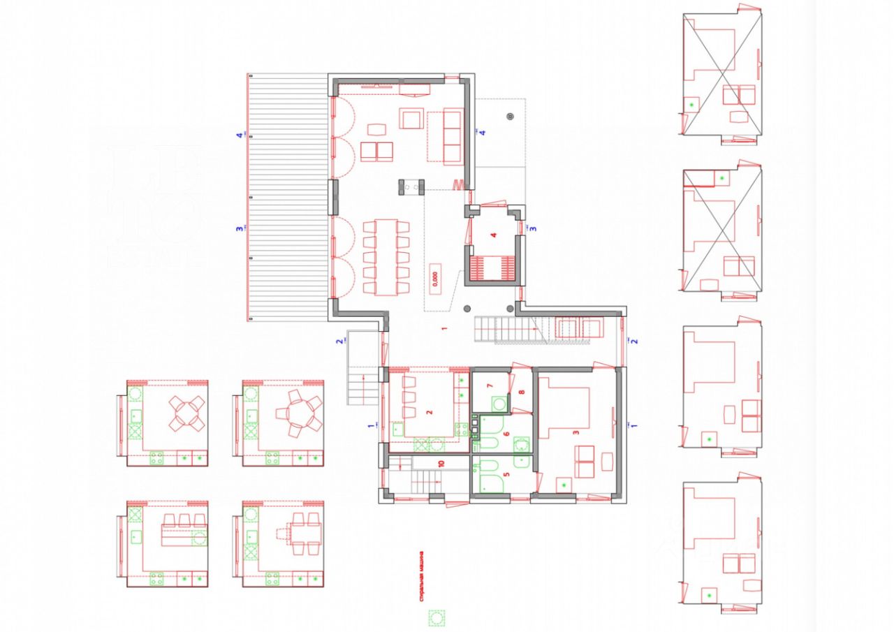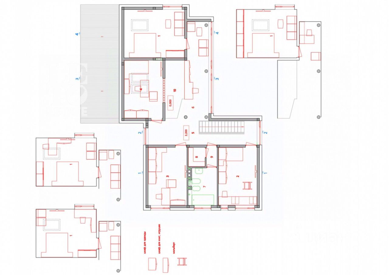 Первый этаж: Холл, гостиная, кухня, столовая, санузел, постирочная, спальня со своим санузлом. Второй этаж: четыре спальни, санузел