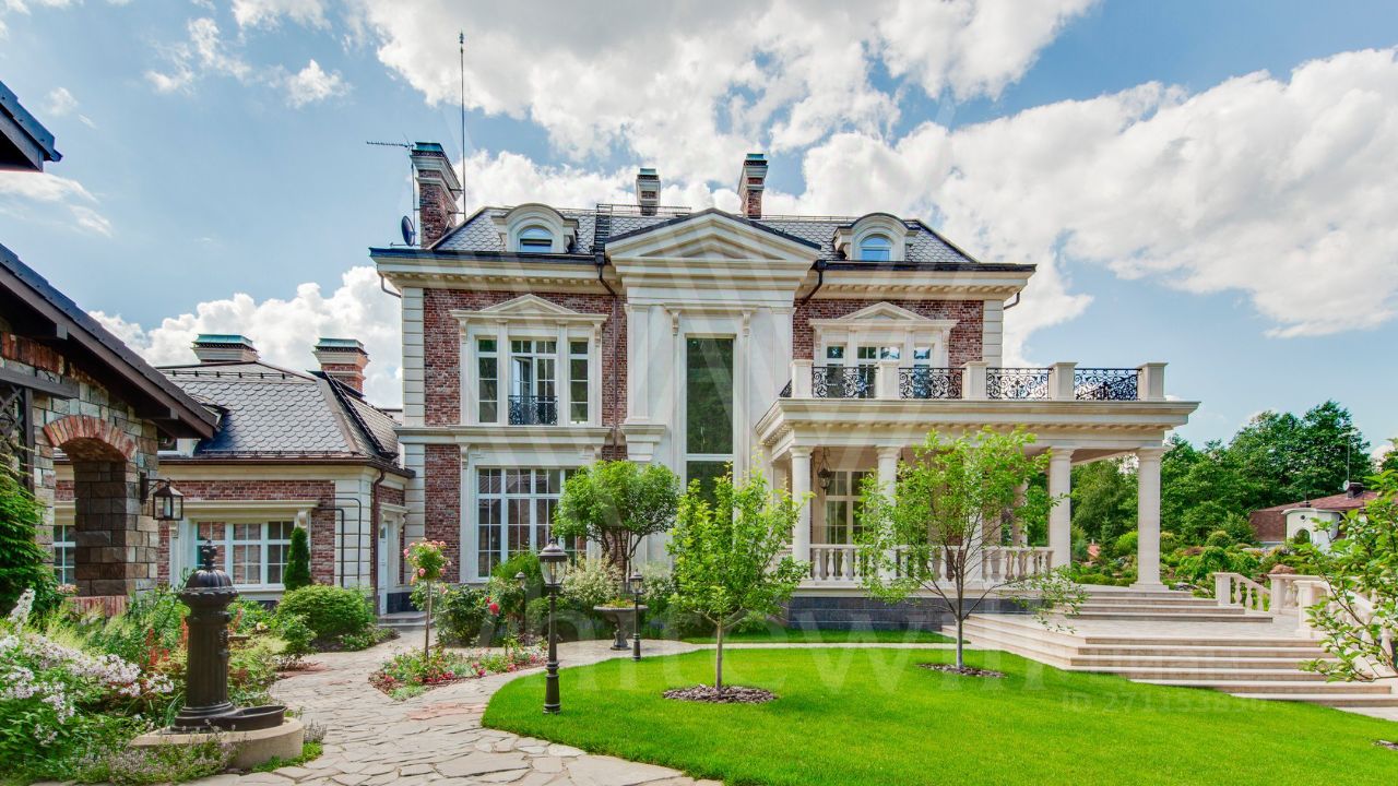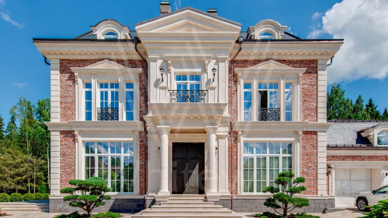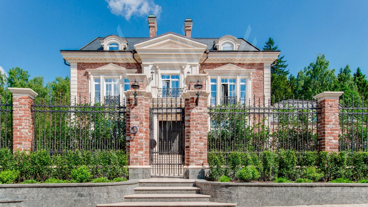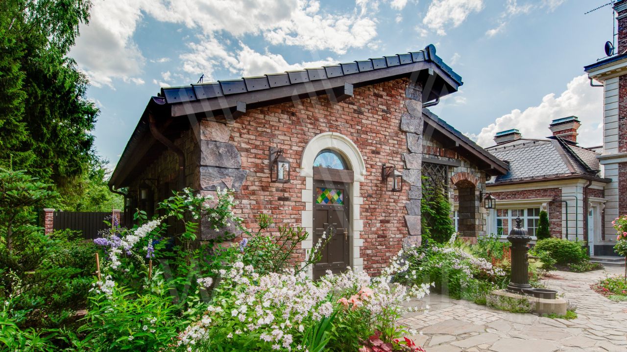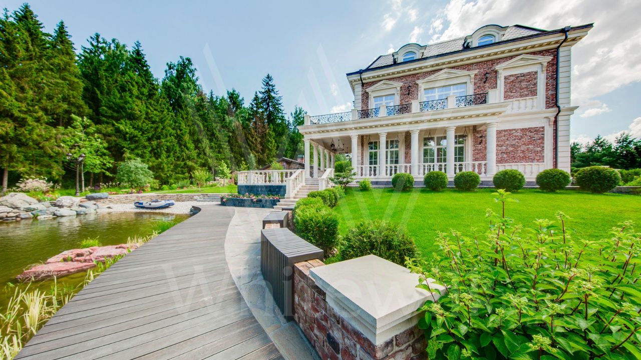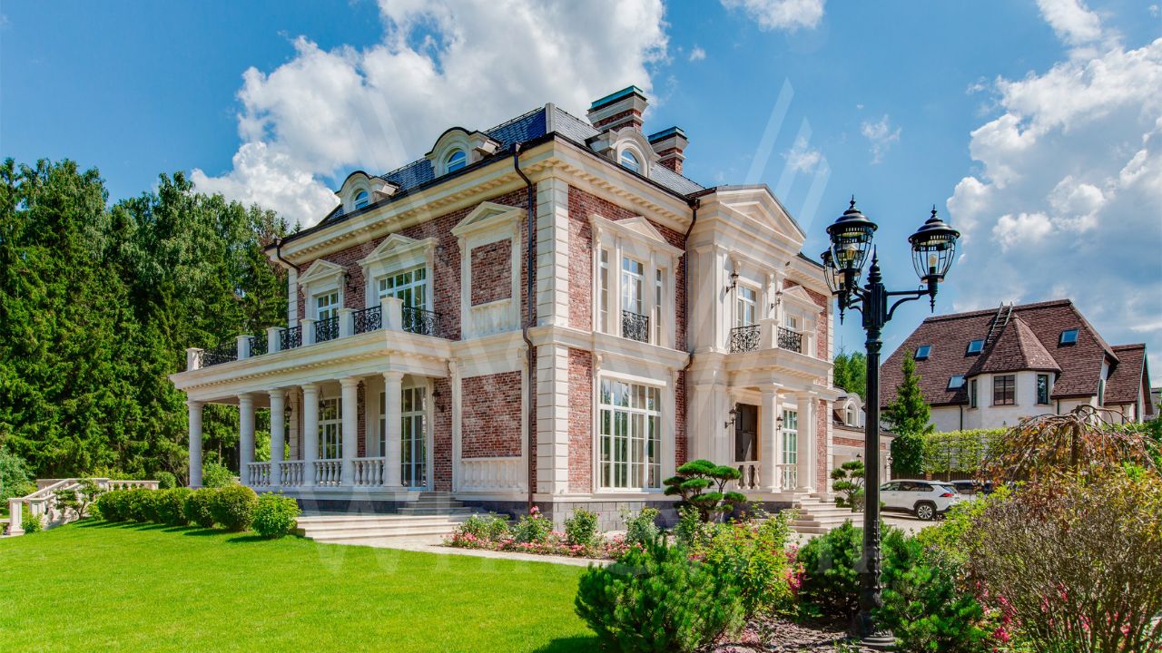 ID 10 069. Глаголево парк. Загородный дом площадью 700 м² без отделки расположен на просторном участке 1 гектар, половину которого занимает вековой сосново-еловый лес. Фасад в в георгианском стиле современной Великобритании выполнен из красного кирпича, украшен рустовкой, карнизами, наличниками, колоннами и коваными элементами. В резиденции спланировали 6 спален, в первый этаж встроен гараж для 2 машин. На территории предусмотрены охотничий дом с сауной и дом для персонала. На участке выполнен ландшафтный дизайн, обустроен искусственный водоем глубиной 3 метра, уличное освещение, выложены дорожки и высажены растения.