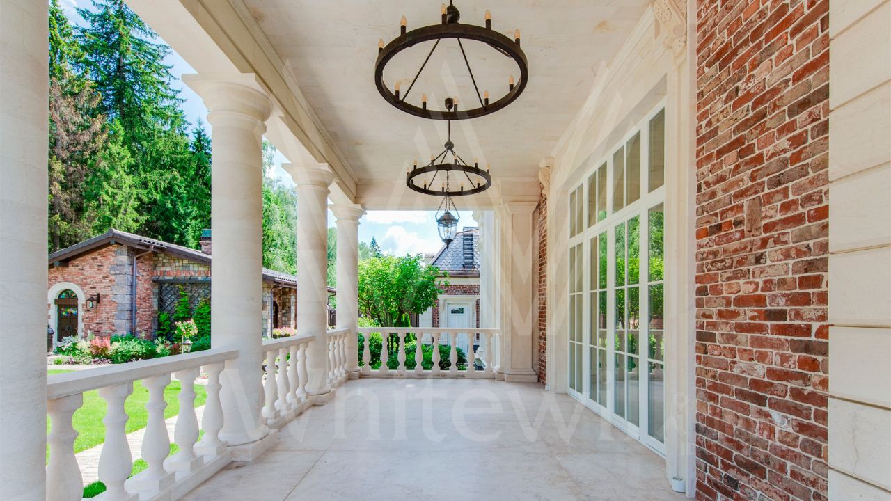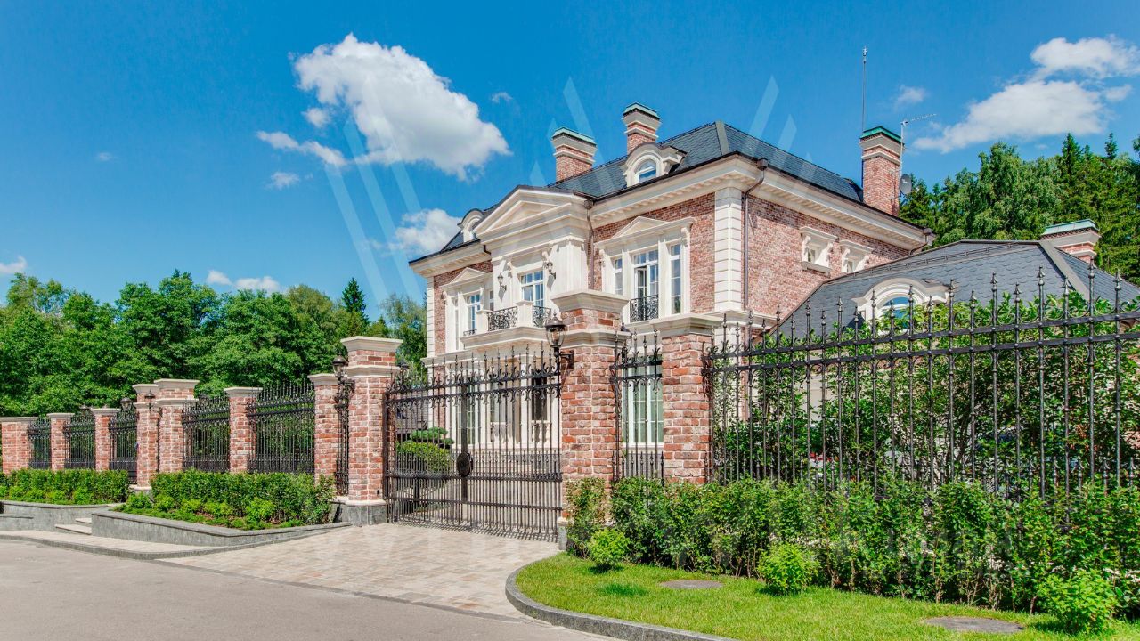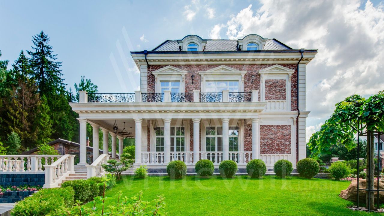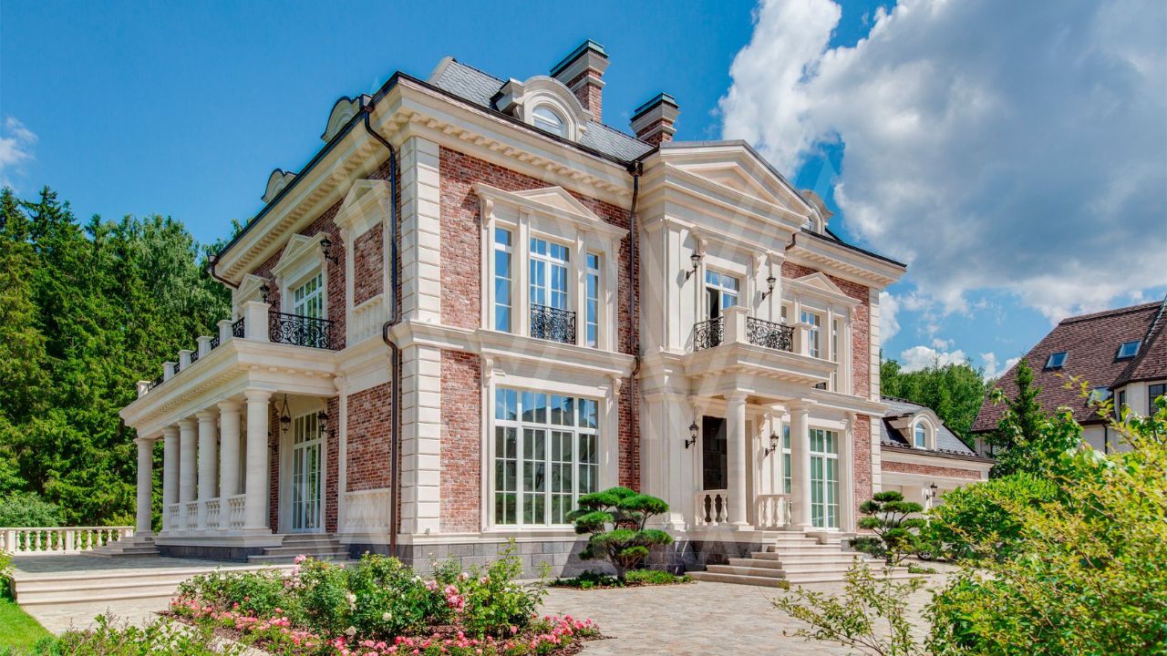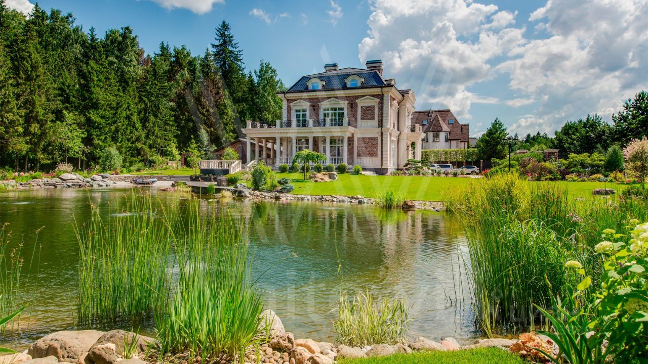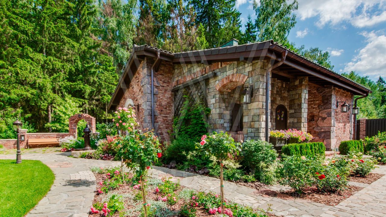 ID 10 069. Глаголево парк. Загородный дом площадью 700 м² без отделки расположен на просторном участке 1 гектар, половину которого занимает вековой сосново-еловый лес. Фасад в в георгианском стиле современной Великобритании выполнен из красного кирпича, украшен рустовкой, карнизами, наличниками, колоннами и коваными элементами. В резиденции спланировали 6 спален, в первый этаж встроен гараж для 2 машин. На территории предусмотрены охотничий дом с сауной и дом для персонала. На участке выполнен ландшафтный дизайн, обустроен искусственный водоем глубиной 3 метра, уличное освещение, выложены дорожки и высажены растения.