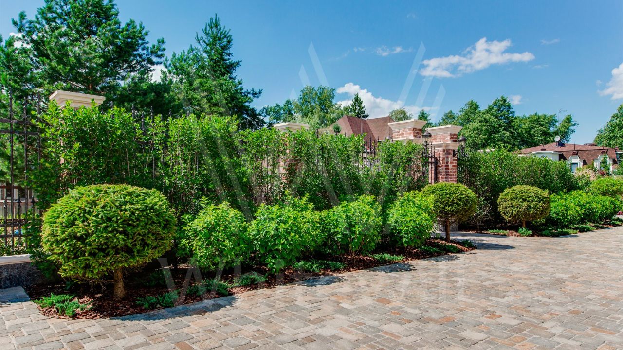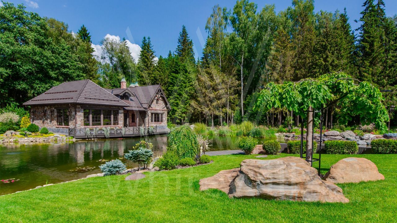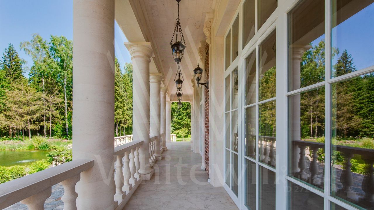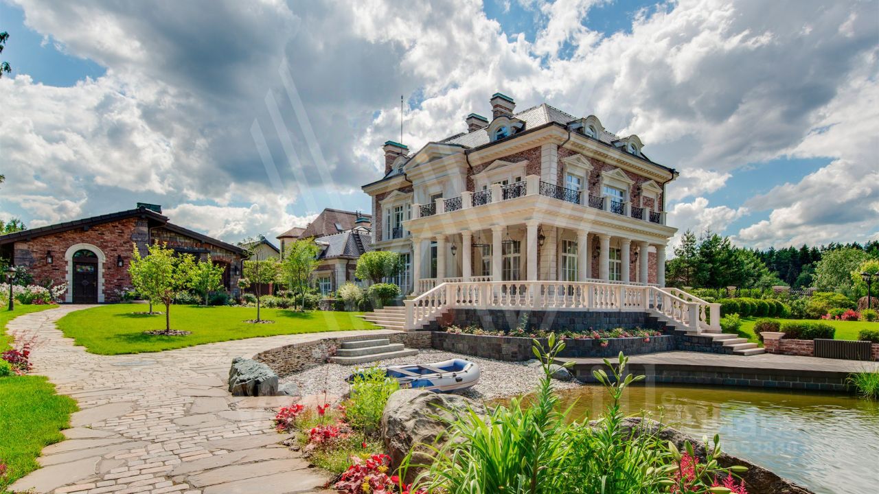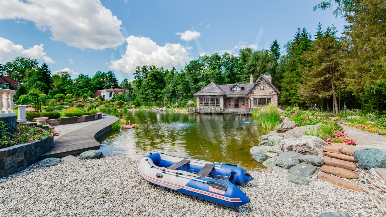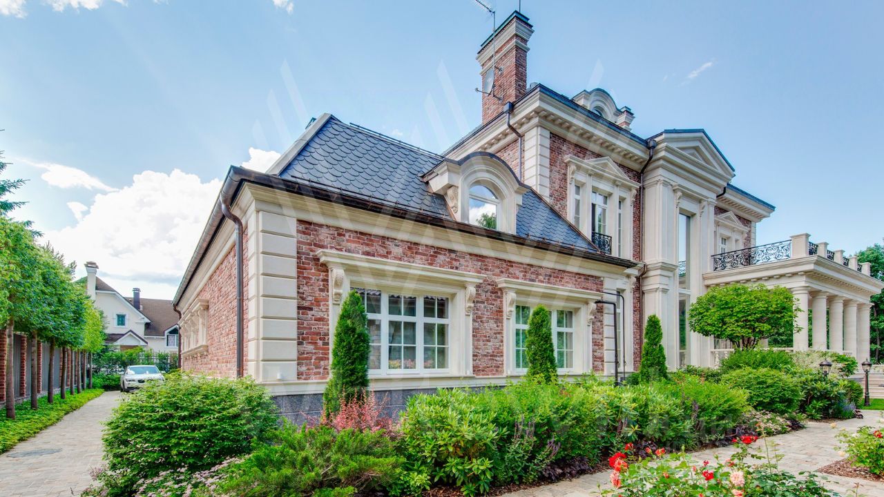 ID 10 069. Глаголево парк. Загородный дом площадью 700 м² без отделки расположен на просторном участке 1 гектар, половину которого занимает вековой сосново-еловый лес. Фасад в в георгианском стиле современной Великобритании выполнен из красного кирпича, украшен рустовкой, карнизами, наличниками, колоннами и коваными элементами. В резиденции спланировали 6 спален, в первый этаж встроен гараж для 2 машин. На территории предусмотрены охотничий дом с сауной и дом для персонала. На участке выполнен ландшафтный дизайн, обустроен искусственный водоем глубиной 3 метра, уличное освещение, выложены дорожки и высажены растения.