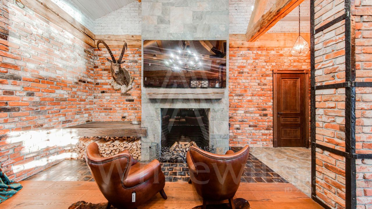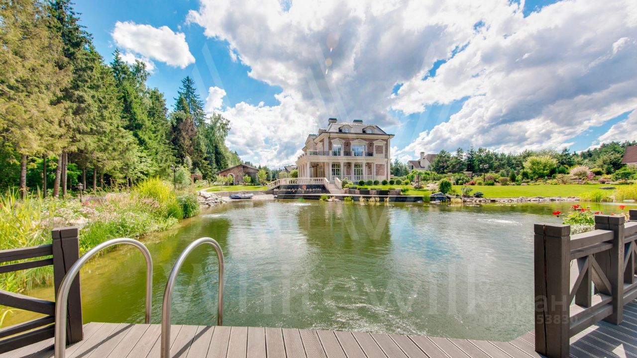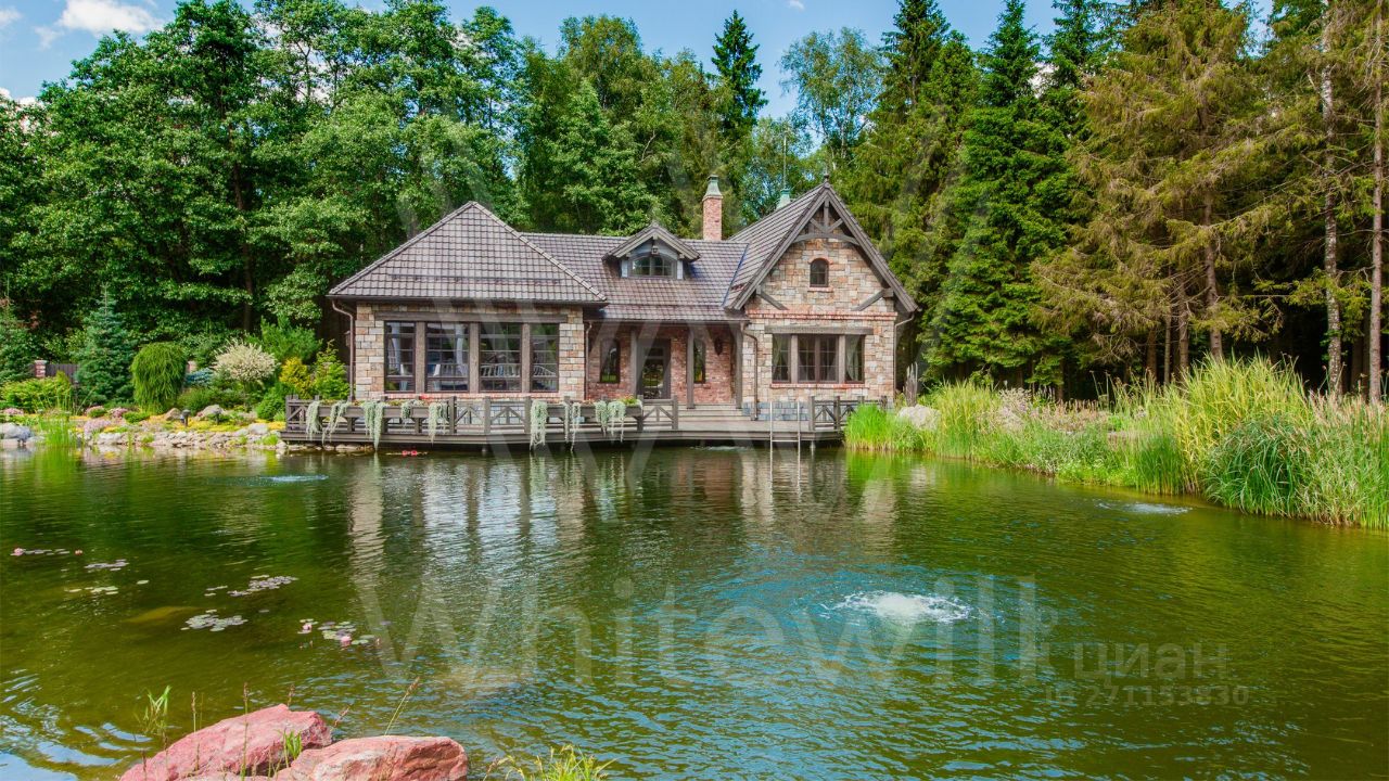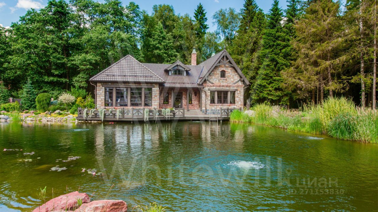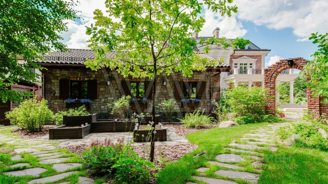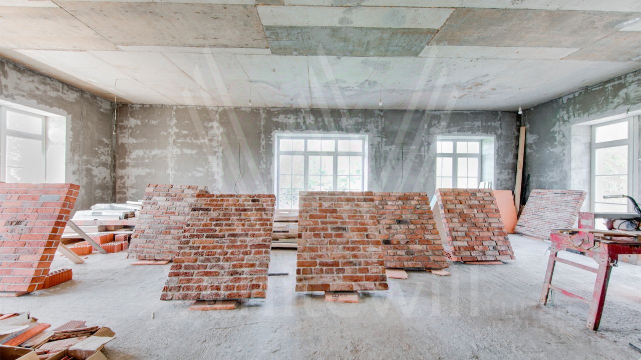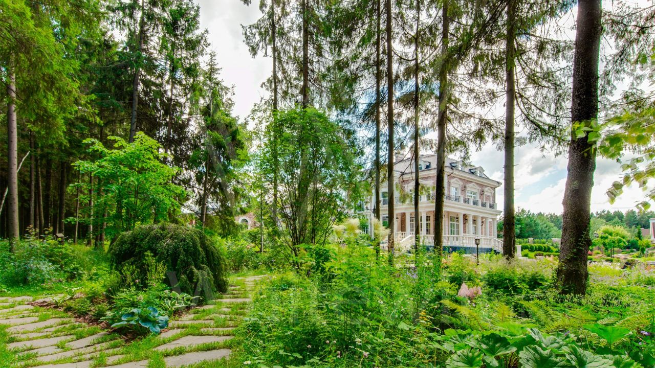 ID 10 069. Глаголево парк. Загородный дом площадью 700 м² без отделки расположен на просторном участке 1 гектар, половину которого занимает вековой сосново-еловый лес. Фасад в в георгианском стиле современной Великобритании выполнен из красного кирпича, украшен рустовкой, карнизами, наличниками, колоннами и коваными элементами. В резиденции спланировали 6 спален, в первый этаж встроен гараж для 2 машин. На территории предусмотрены охотничий дом с сауной и дом для персонала. На участке выполнен ландшафтный дизайн, обустроен искусственный водоем глубиной 3 метра, уличное освещение, выложены дорожки и высажены растения.