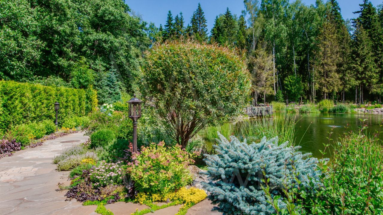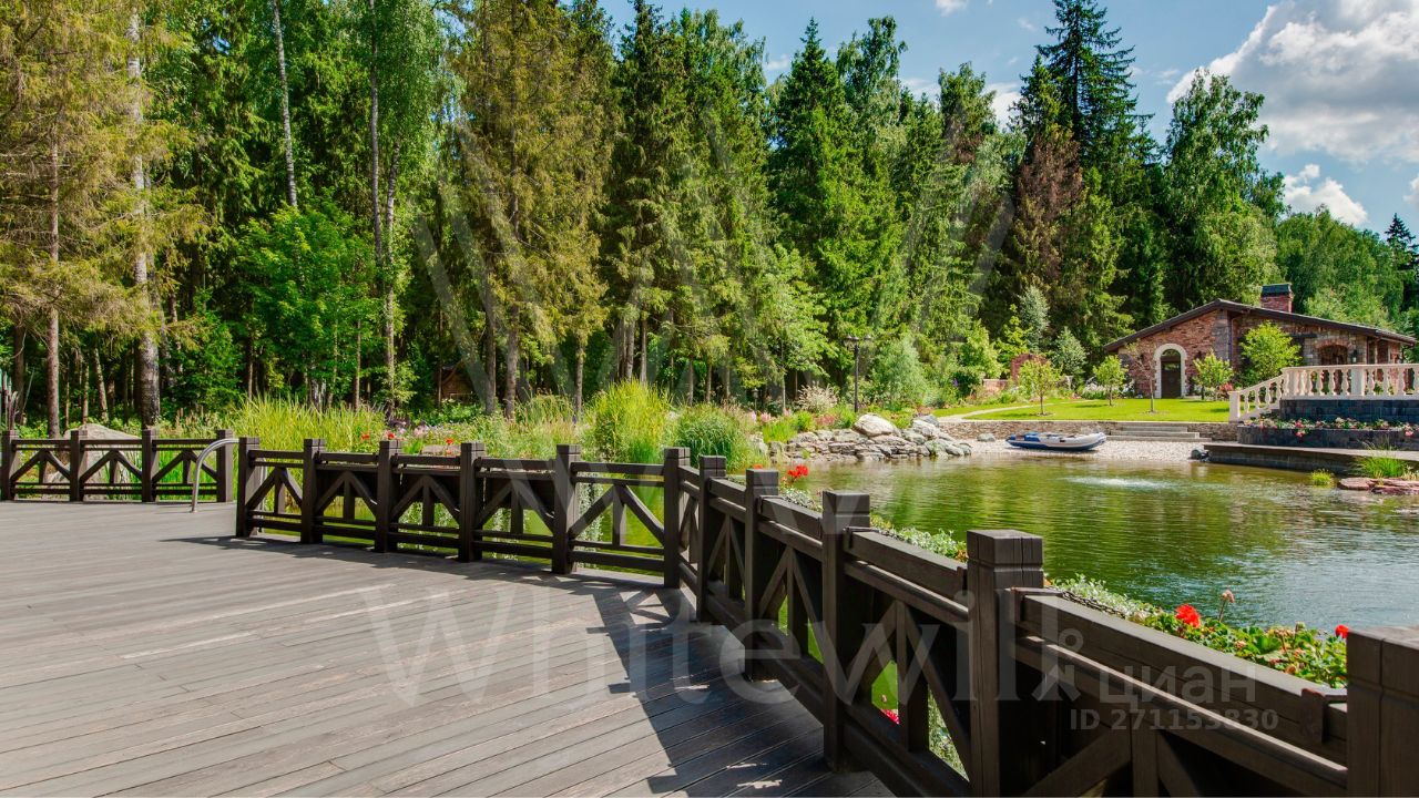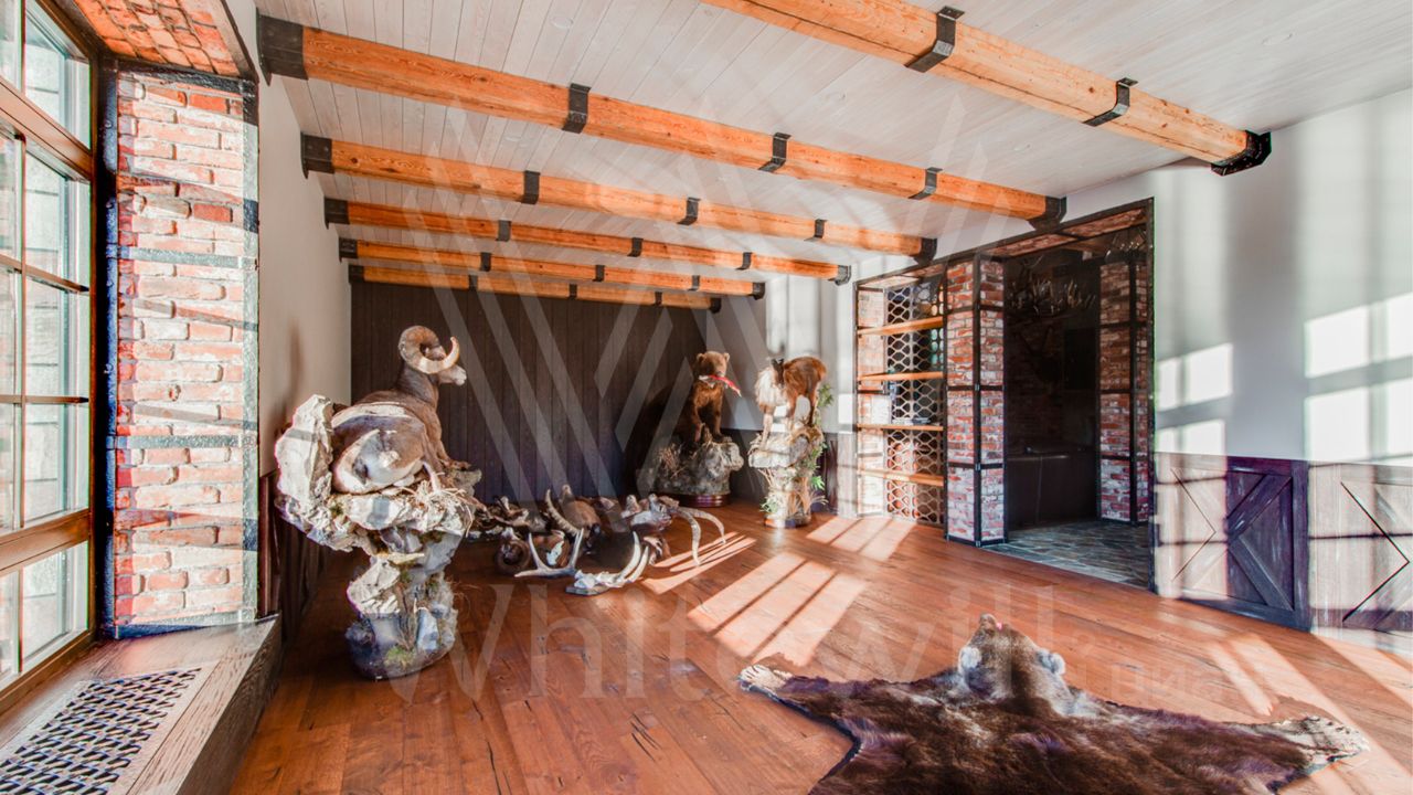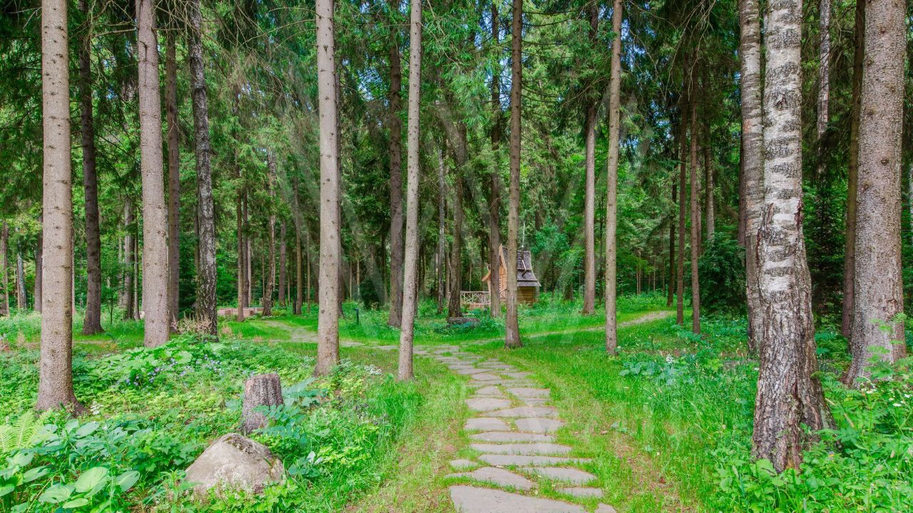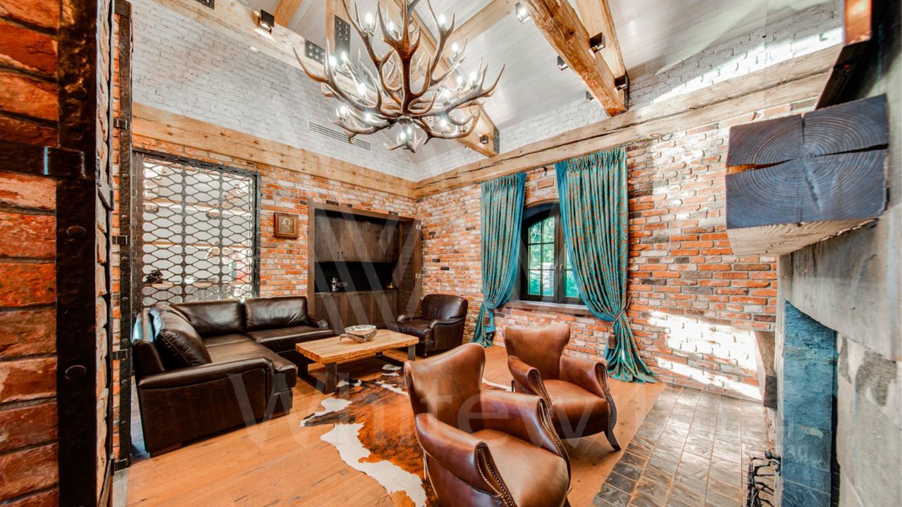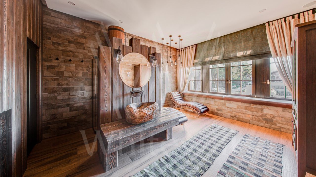 ID 10 069. Глаголево парк. Загородный дом площадью 700 м² без отделки расположен на просторном участке 1 гектар, половину которого занимает вековой сосново-еловый лес. Фасад в в георгианском стиле современной Великобритании выполнен из красного кирпича, украшен рустовкой, карнизами, наличниками, колоннами и коваными элементами. В резиденции спланировали 6 спален, в первый этаж встроен гараж для 2 машин. На территории предусмотрены охотничий дом с сауной и дом для персонала. На участке выполнен ландшафтный дизайн, обустроен искусственный водоем глубиной 3 метра, уличное освещение, выложены дорожки и высажены растения.