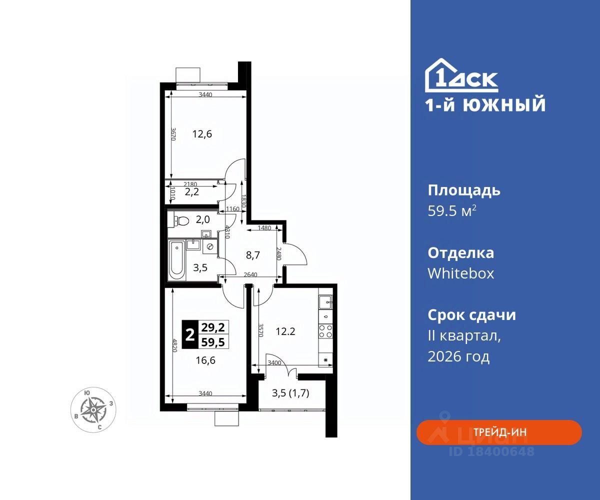 продам 2-к, Первый Южный ЖК, 1.312 130 384 ₽