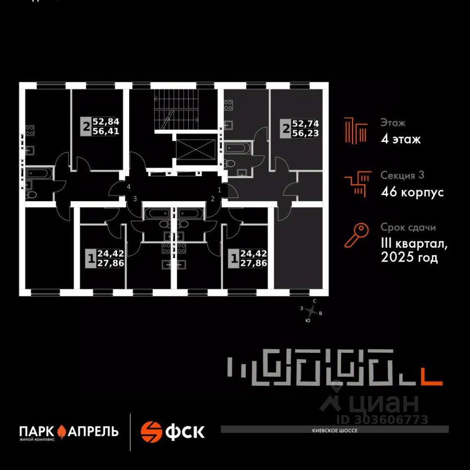 Прямая продажа от застройщика! Загородный жилой комплекс класса Комфорт Плюс. Продаётся 2-к квартира номер 52 общей площадью 56.23 кв.м на 4-м этаже 4 этажного дома. Без отделки.