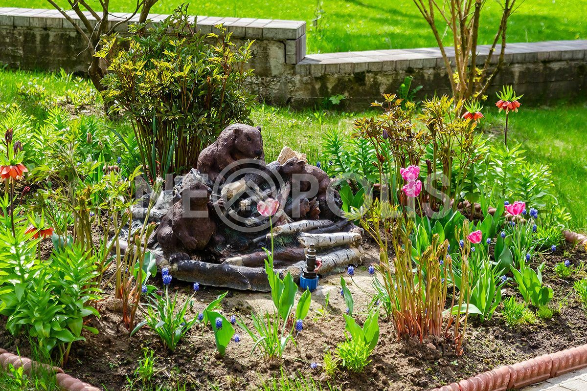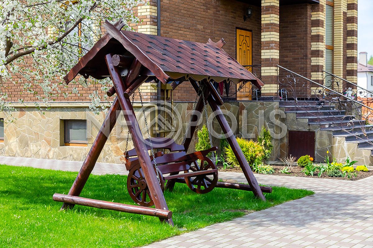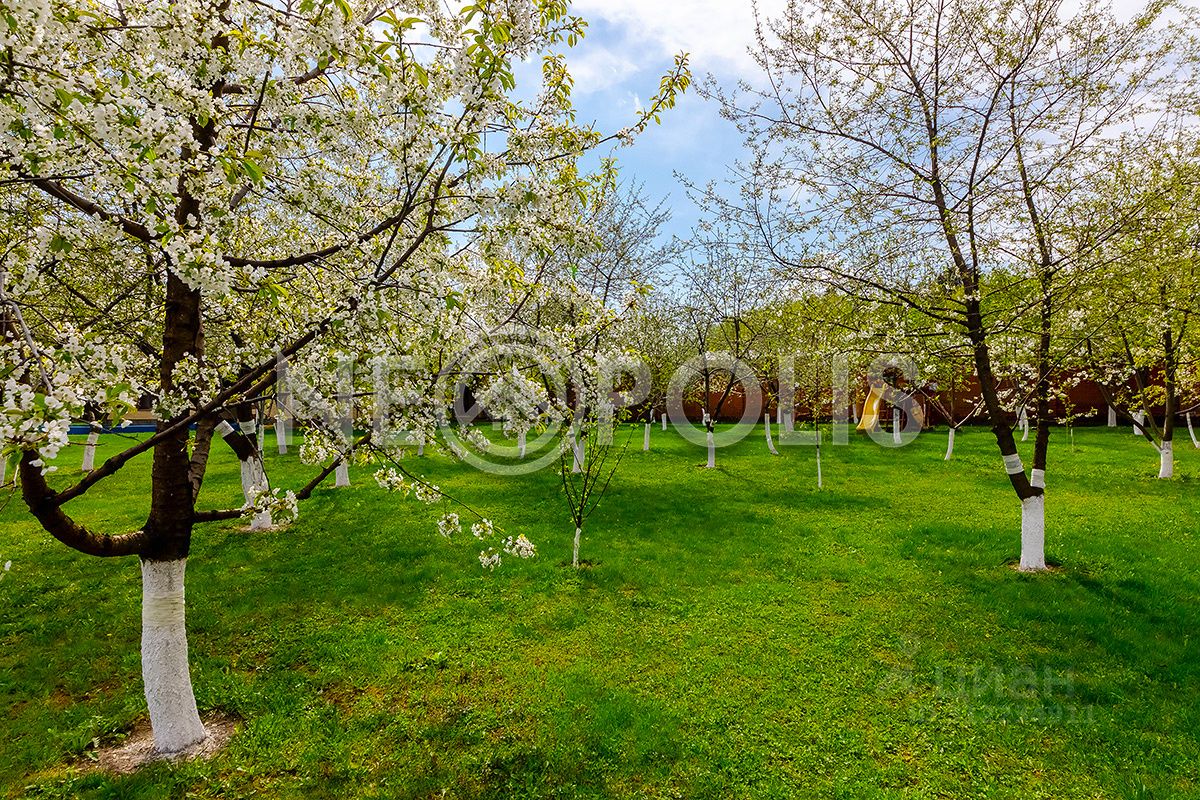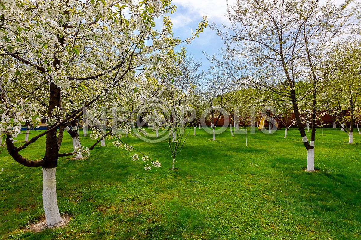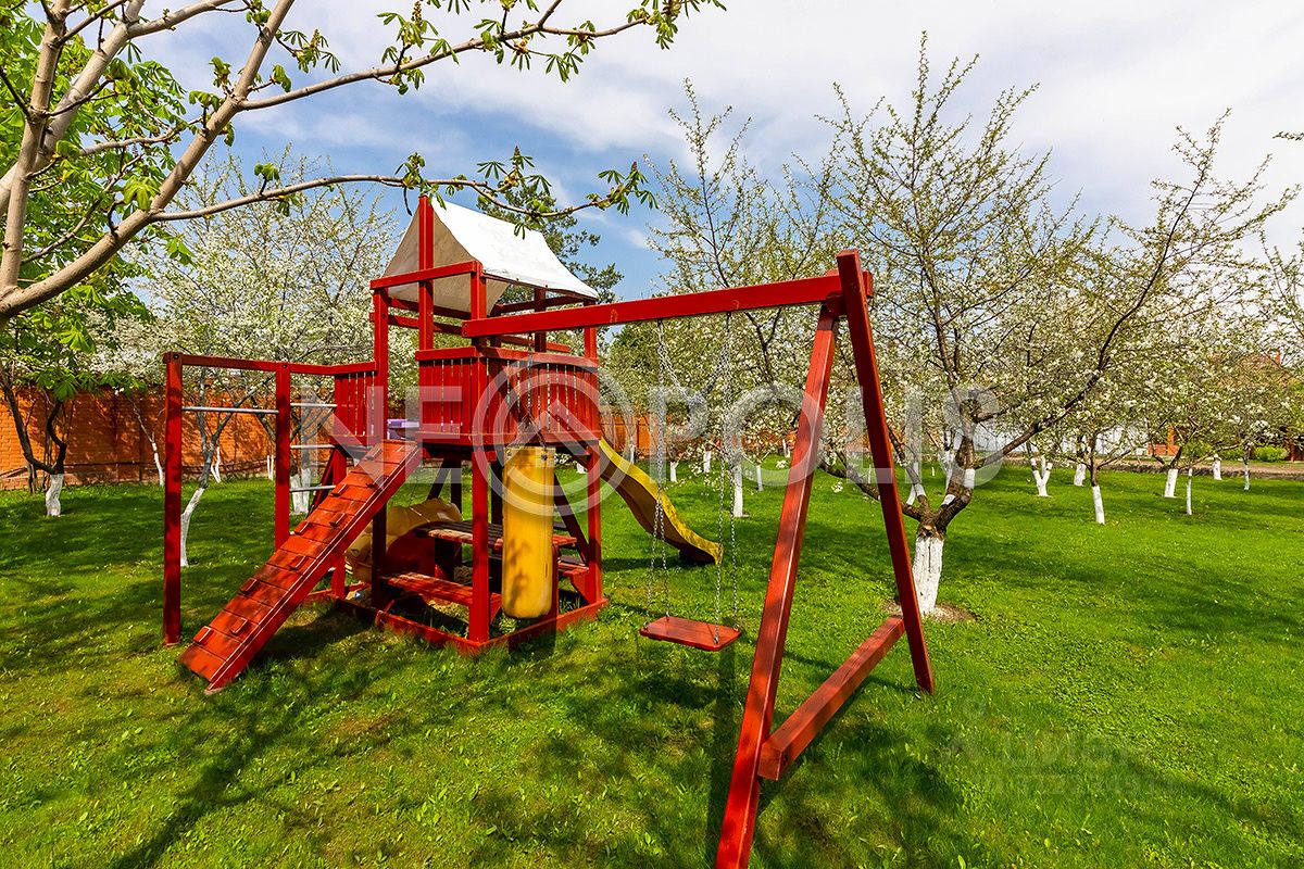 Большой участок с выполненным ландшафтным дизайном, дорожки выложены брусчаткой, на территории есть собственный плодовый сад, детская площадка, высажены хвойные и лиственные деревья. Участок огорожен по периметру кирпичным забором, полностью освещен, въезд организован через автоматические распашные ворота. Установлена дренажная система с выводом по рельефу в реку.