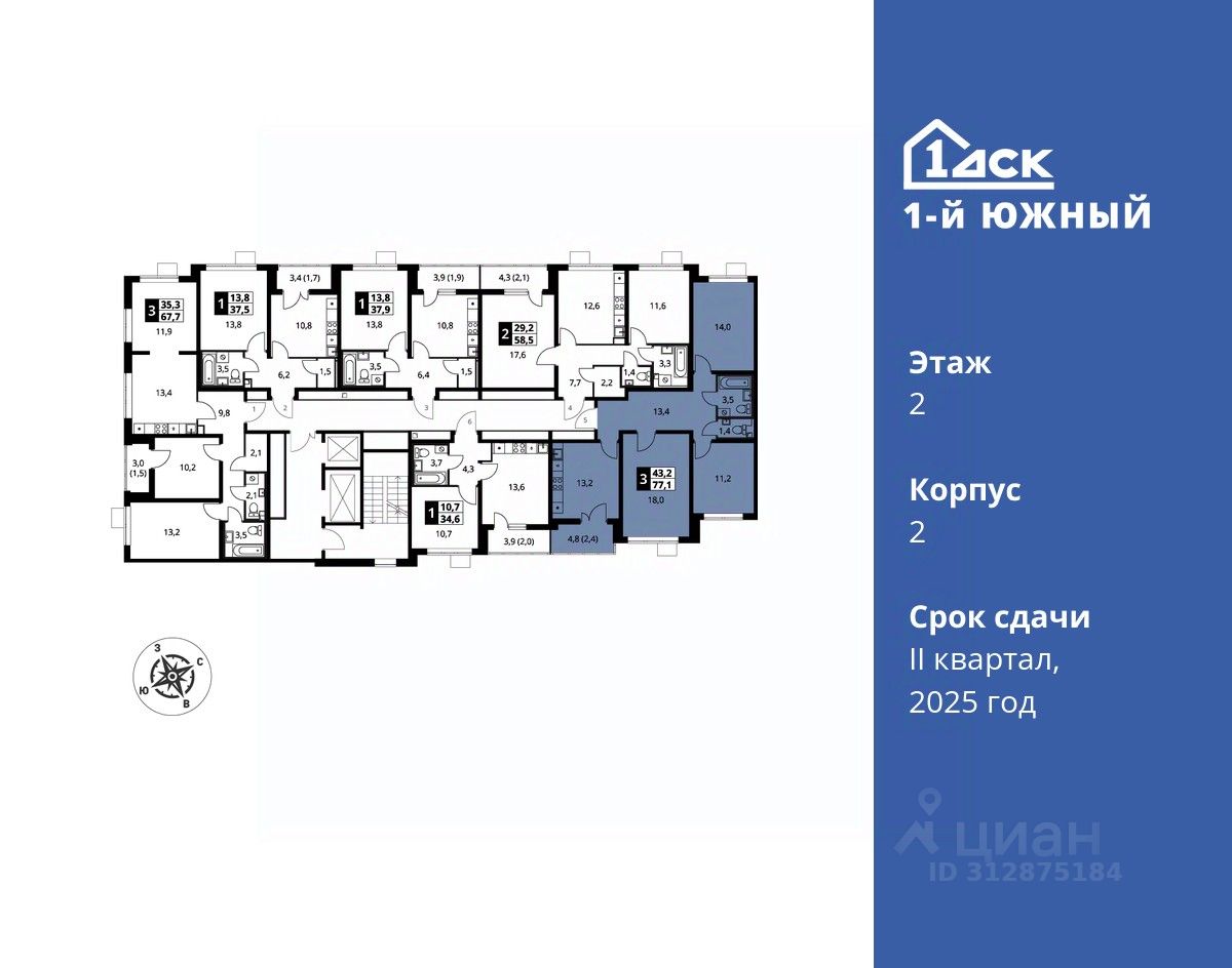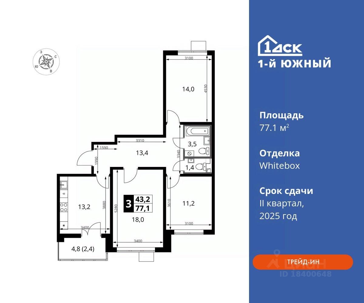 Максимальные скидки при 100% оплате. Trade-in вместо первоначального взноса - выгодно обменяйте вашу квартиру на новую! Корпус сдан! Прямая продажа от застройщика! Жилой Комплекс класса Комфорт плюс. Продаётся 3-к квартира номер 97 в сданном корпусе общей площадью 77.1 кв.м на 2-м этаже 24 этажного дома.