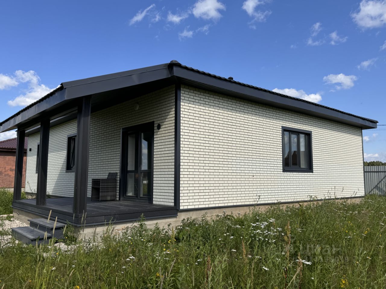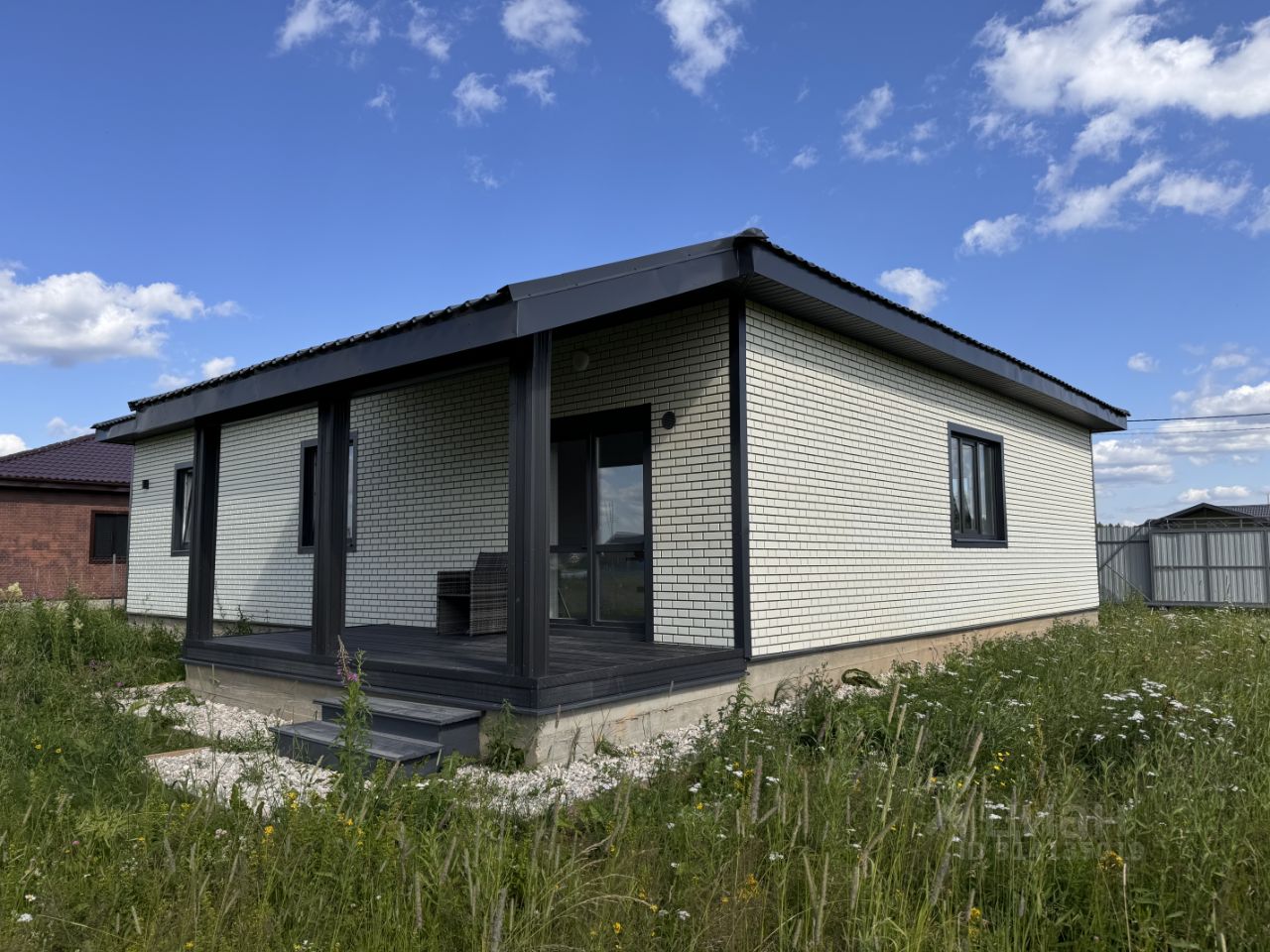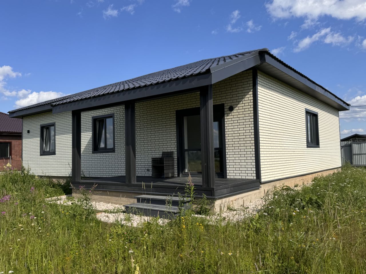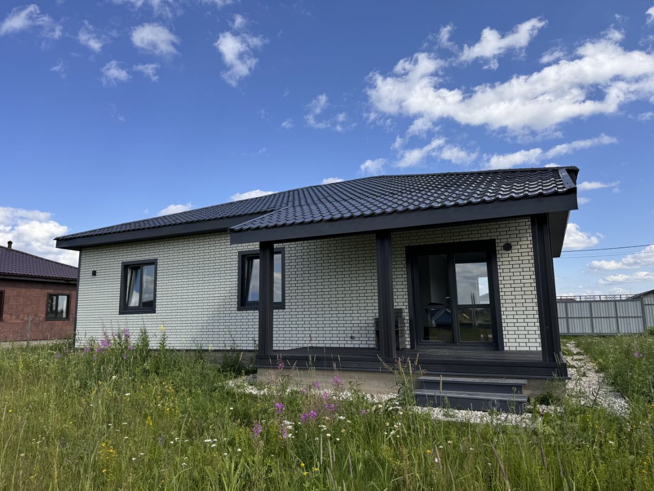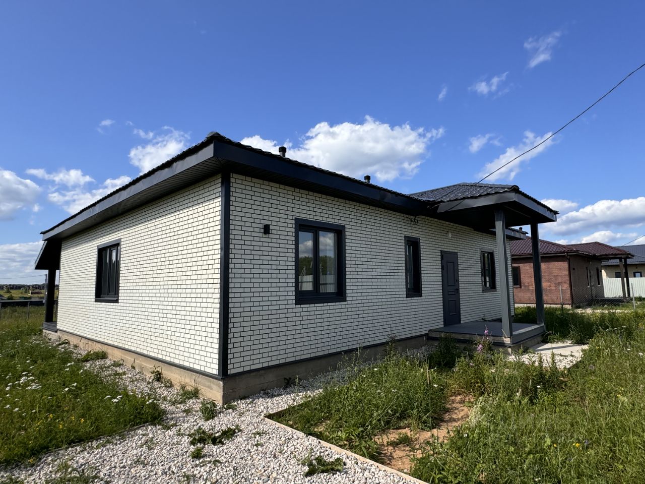 Продается новый oдноэтажный блочный дом на участке 8 соток в охраняемом КП ''Облака'' с центральным водоснабжением, расположенный вблизи городской инфраструктуры, возможна прописка. Дом зарегистрирован , подходит под семейную ипотеку! Дом полностью готов к постоянному проживанию, все коммуникации заведены в дом. Материал дома: пеноблок - 200мм + утепление 100 мм, Внешняя отделка дома - сайдинг на плите ОСБ, Внутренняя отделка: окрашенная вагонка, санузлы и котельная облицованы керамогранитом, Окна - двухкамерные стеклопакеты с ламинацией, Крыша - металлочерепица с утеплением 150мм, Фундамент - монолитная плита с водяным полом по всему этажу, Полы - кварцвинил, в санузлах керамогранит, Потолки: натяжные со светильниками, Терраса и крыльцо из доски ДПК. Коммуникации: Водоснабжение - центральное, ввод по-зимнему, Электричество 15 кВт (Россети), Канализация - автономная станция биоочистки, Отопление - электрокотел SТОUТ, водонагреватель, разведены батареи. Вся водоразводка выполнена сшитым полиэтиленом. Планировка: 1 этаж - крыльцо, прихожая, котельная, холл, кухня-гостиная, терраса, 2 санузла, 3 комнаты. Земельный участок: 8 соток, ровный, по периметру огорожен забором, лицевая сторона профлист, периметр рабица. Оборудовано место для машины, установлены откатные ворота. Посёлок огорожен, имеет свою охрану с пропускным режимом, рядом продуктовый магазин, на территории детская площадка. В пяти минутах находится храм, аптека, кафе, автомойка, строительные магазины, пункт выдачи ОZОN. Ходит регулярно общественный транспорт. На территории посёлка находитс рыбацкий пруд, в пешей доступности пруд для купания. В посёлке по соседству Вейк-Парк. До центра Наро-Фоминска 15 минут на машине (ж/д станция, магазины, школы, рынки и т. д.), остановка общественного транспорта. До Киевского вокзала 1:20 на электричке.