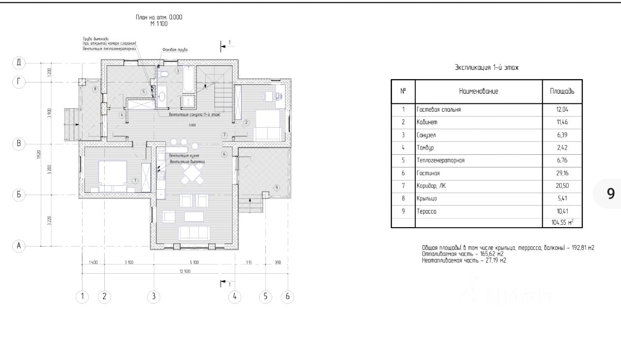 1 этаж: тамбур, котельная, гостевая спальня 12 кв.м, кабинет 12 кв.м, санузел, кухня-столовая-гостиная 29 кв.м с выходом на крытую террасу, кладовая.