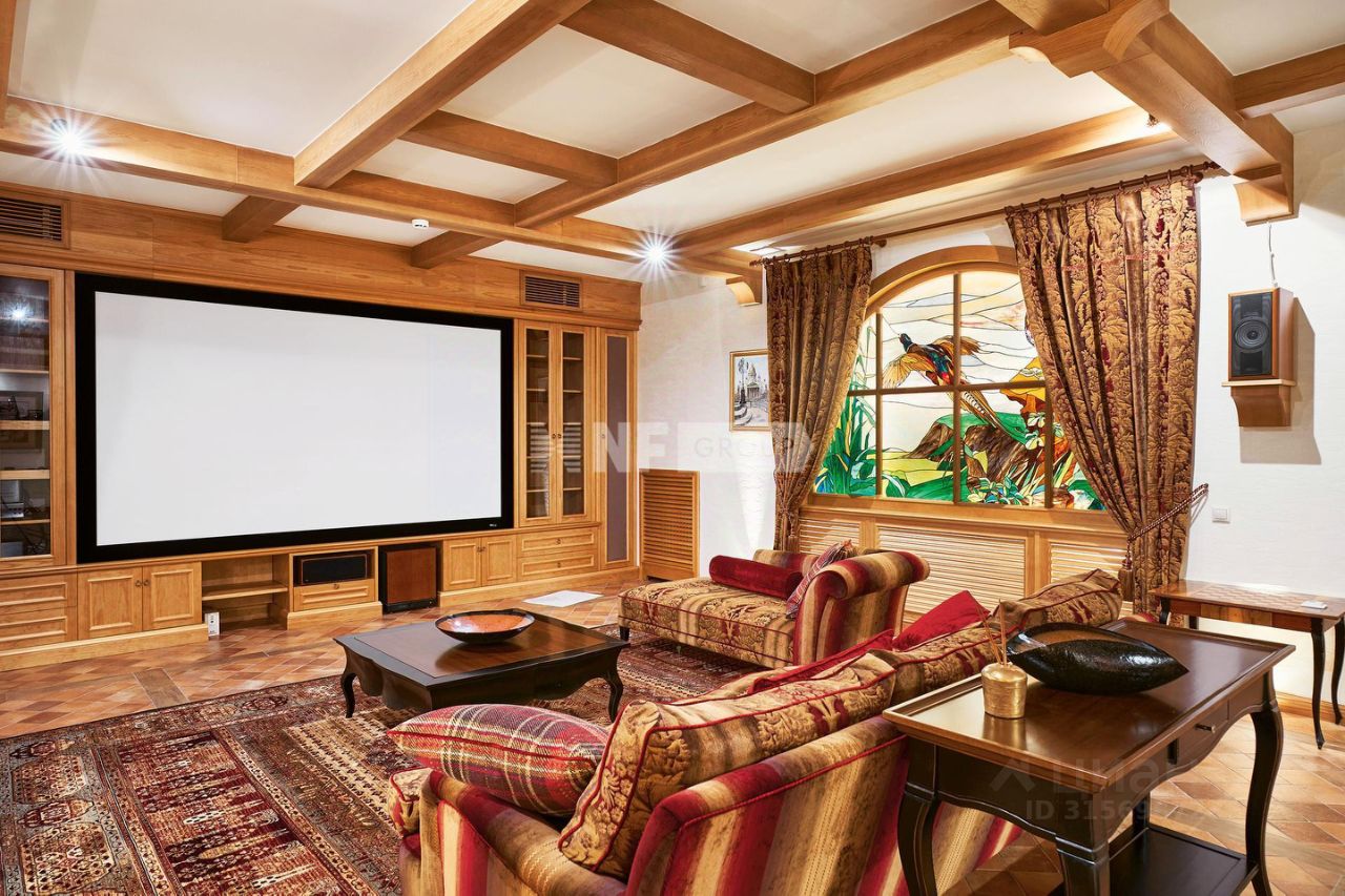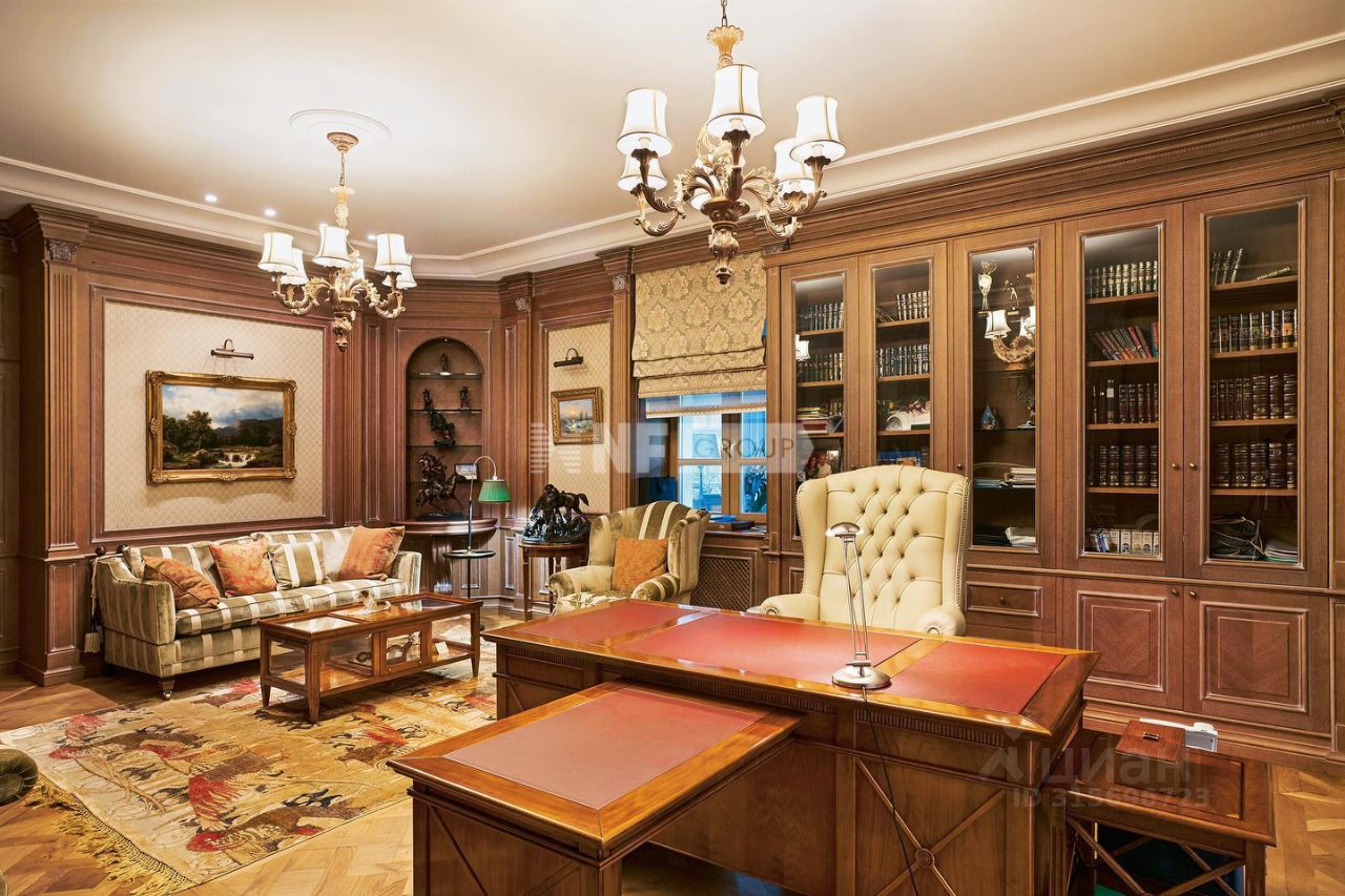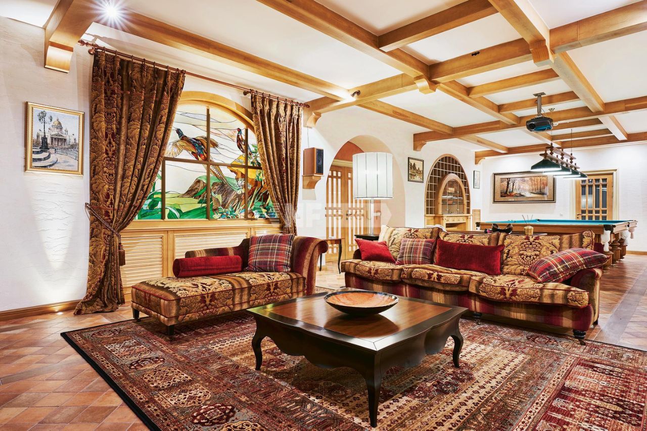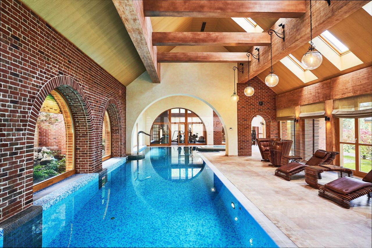 Расположенная на просторном участке 50 соток, загородная резиденция объединяет 4 архитектурных объекта в едином стиле швейцарского шале: трехуровневый жилой дом, двухуровневый SPA-комплекс, дом для персонала и гараж с постом охраны. Широкие силуэты крыш с мощной системой стропил из хвойных пород деревьев органично сливаются с кронами вековых деревьев, создавая гармоничный ансамбль, где кирпичная кладка сочетается с бревнами ручной рубки. Жилой дом площадью 1185 м² наполнен естественным светом благодаря панорамным окнам, второму свету в гостиной и высоким потолкам. Интерьеры демонстрируют стиль тихой роскоши: - Кухня с мебелью Mantegna от Angelo Cappellini в классическом стиле, - Гостиная с диванами Bruno Zampa, витринами Angelo Cappellini и светильниками Zonca, где готический модерн сводов сочетается с элегантной классикой камина, - Рабочий кабинет с библиотекой, письменным столом Tosato и креслами Masheroni, - Спальни, оформленные в классическом и современном стилях с мебелью Cimarosa*, Flai и дизайнерскими светильниками Bover.