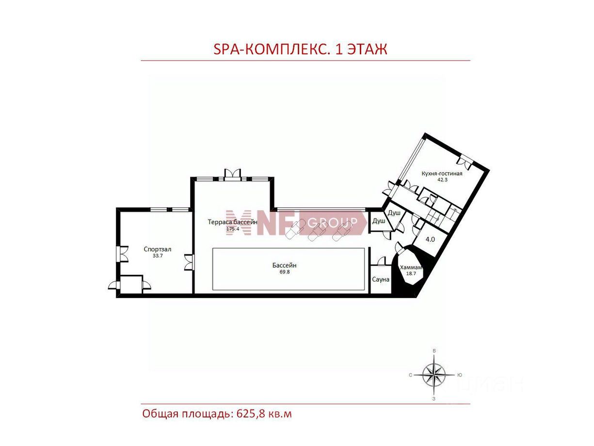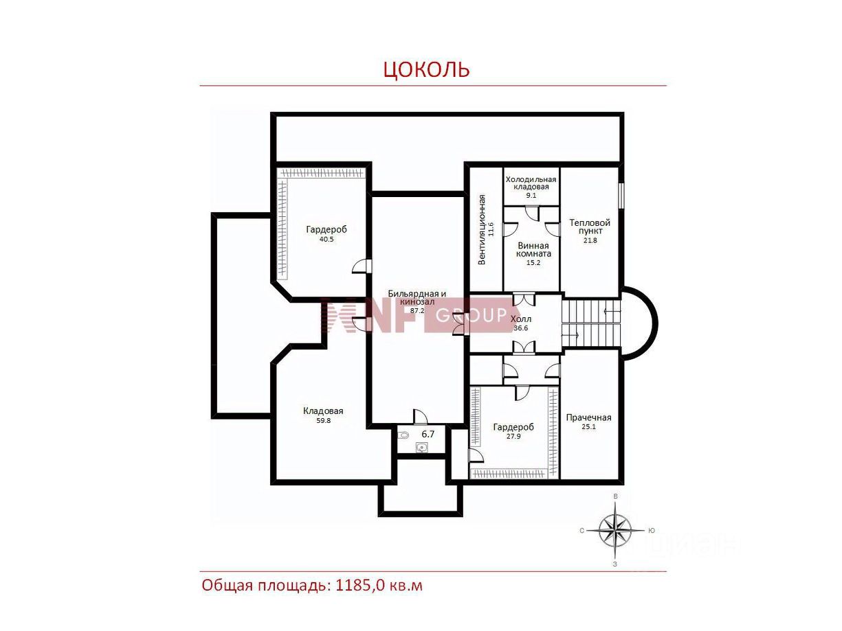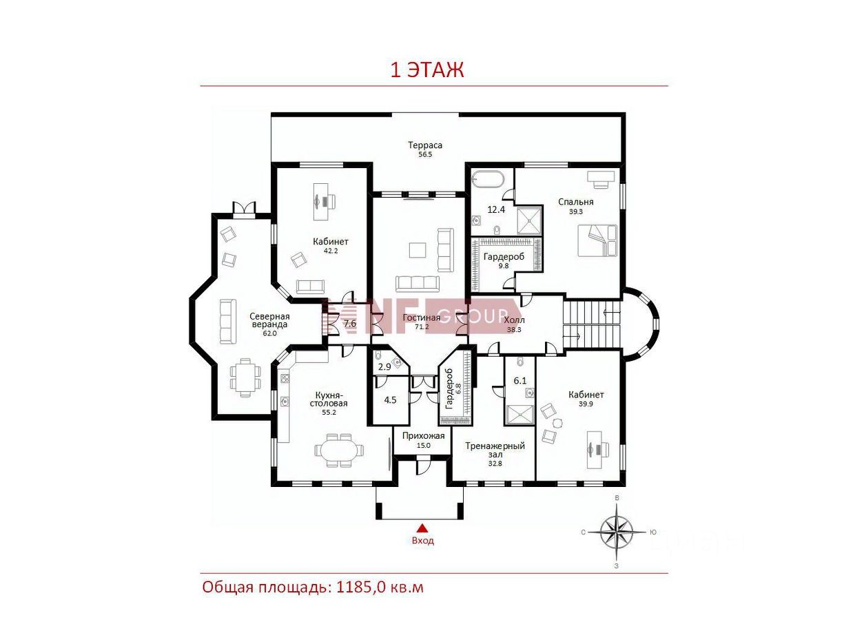 1 этаж: холл, прихожая, гардеробная, с/у, кухня-столовая, северная веранда для приема гостей, кабинет с выходом на террасу, гостиная с камином, тренажерный зал, с/у, кабинет, хозяйская спальня с гардеробной и с/у и выходом на просторную террасу. 2 этаж: галерея, холл, спальня детская с с/у и гардеробной, спальня с с/у, хоз.помещения, спальня с гардеробной, с/у, спальня. Цокольный этаж: холл, бильярдная и кинозал, с/у, 2 большие гардеробные для хранения сезонной одежды, холодильник для шуб, кладовая, постирочная, кладовая, винная комната, технические помещения.