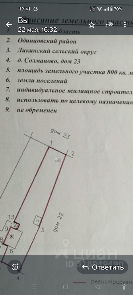 Арт. 105910138 Продается участок 8,0 соток, ИЖС, в деревне Солманово Одинцовского района. Экологичное, тихое место. Отличный подъезд до участка. Рядом инфраструктура Лесного городка. Большой ТЦ ''Городок'', магазины -''Родовой герб'', ''Пятерочка'', '' Магнит'', ''Перекрёсток'', ''Вкусно и точка'', кинотеатр, школа и садик. Поблизости два пруда (рыбалка), стрелковый клуб, ресторан, спортинг клуб ''Москва'' Транспортная доступность - МЦД - 4 ( Ж/Д ''Лесной городок'') - автобус до станции метро Парк Победы. Удобный выезд на Минское и Можайское шоссе. Рядом платный обход г Одинцово. От МКАД -17 км. На участке (один собственник) имеется: старый дом (2/3 доли), отопление печное, сарай и колодец (9 колец). Электричество и газ заведены на участок. К.н. 50:20:0070226:65