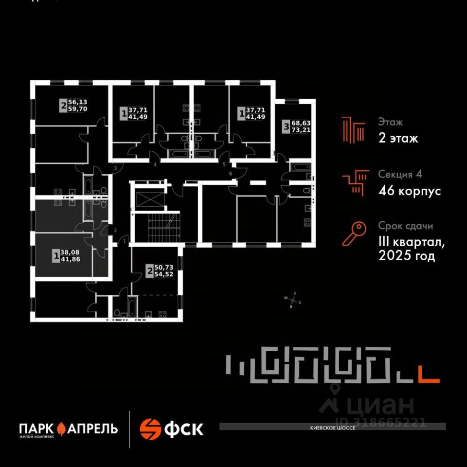 Прямая продажа от застройщика! Загородный жилой комплекс класса Комфорт Плюс. Продаётся 1-к квартира номер 57 общей площадью 41.86 кв.м на 2-м этаже 4 этажного дома. Без отделки.