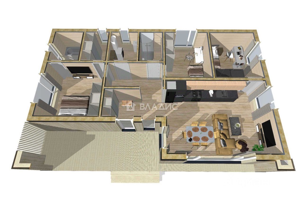 - Гостиная-Кухня, - Тамбур с выходом на террасу, - Мастер спальня с выходом в гардеробную и санузел, - Гостевая спальня-1, - Гостевая спальня-2, - Ванная комната, - Техническое помещение, - Холл (центральный),