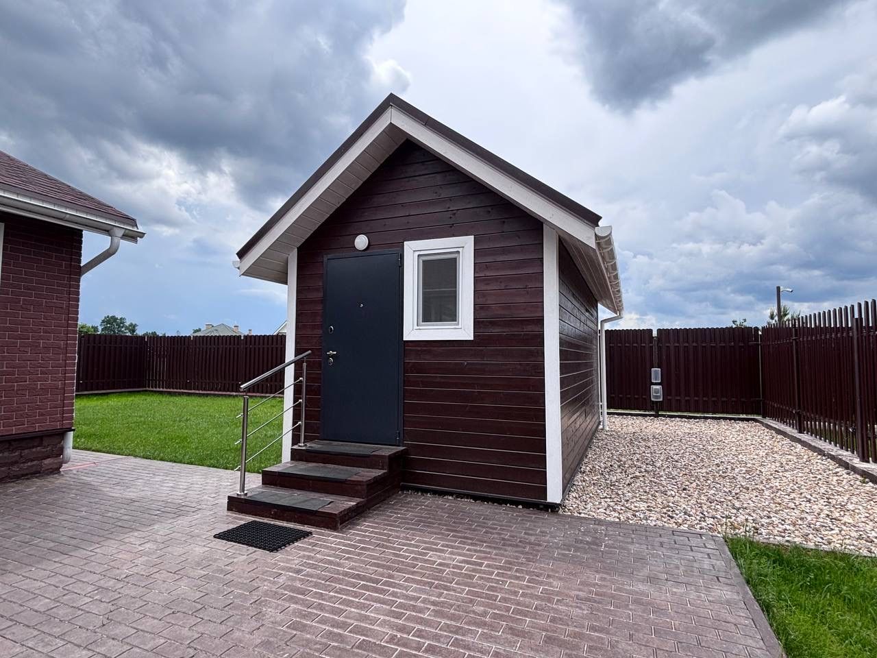 Также на участке есть небольшой гостевой дом, готовый к проживанию. Участок правильной формы, с газоном, дренажная система по всему участку. Дорожки выложены плиткой, есть место для парковки автотранспорта.
