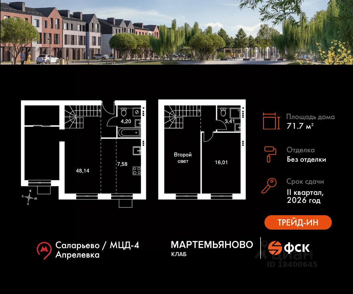 Расположение комплекса: ''Мартемьяново Клаб'' - клубный поселок таунхаусов от ФСК в Наро-Фоминском городском округе. Счастливая жизнь складывается из плюсов двух миров: городского и загородного. Вы наслаждаетесь свежим воздухом, лесными пейзажами вокруг и отдыхом у собственного пруда. При этом пользуетесь комфортной инфраструктурой, всеми центральными коммуникациями, собственной современной школой и детским садом. Закрытая охраняемая территория дарит вам чувство спокойствия и безопасности. А заказать все услуги возможно через мобильное приложение управляющей компании. Выбираться во внешний мир легко благодаря хорошей транспортной доступности.