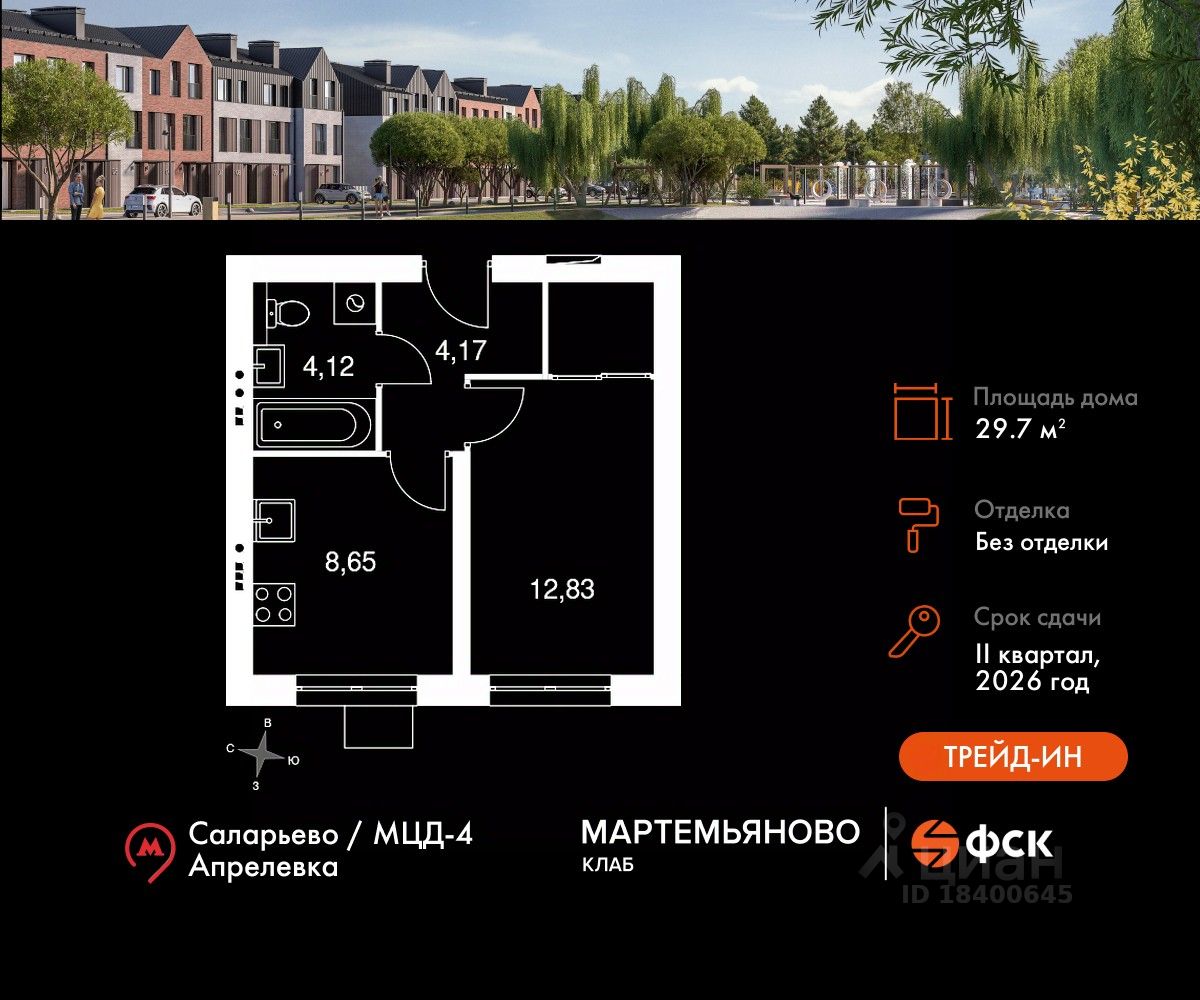 Расположение комплекса: ''Мартемьяново Клаб'' - клубный поселок таунхаусов от ФСК в Наро-Фоминском городском округе. Счастливая жизнь складывается из плюсов двух миров: городского и загородного. Вы наслаждаетесь свежим воздухом, лесными пейзажами вокруг и отдыхом у собственного пруда. При этом пользуетесь комфортной инфраструктурой, всеми центральными коммуникациями, собственной современной школой и детским садом. Закрытая охраняемая территория дарит вам чувство спокойствия и безопасности. А заказать все услуги возможно через мобильное приложение управляющей компании. Выбираться во внешний мир легко благодаря хорошей транспортной доступности.