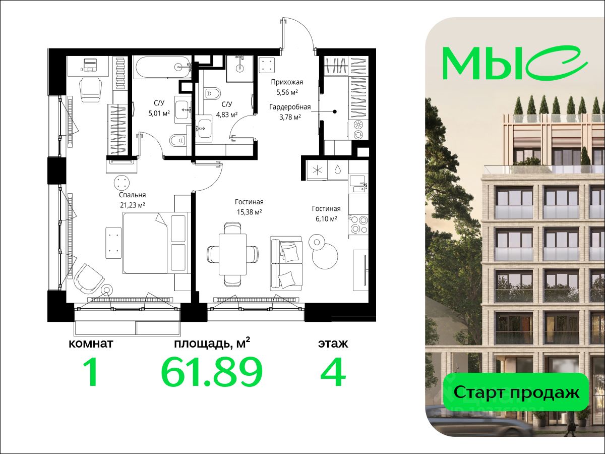В продаже квартира площадью 61.89 кв. м без отделки на 4 этаже 8 этажного дома. Квартира находится в премиальном жилом комплексе ''МЫС'' (Застройщик - MR Group).