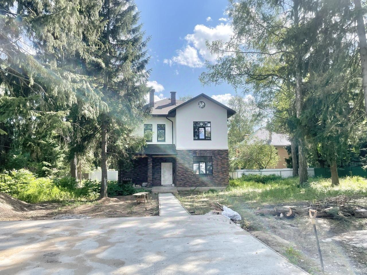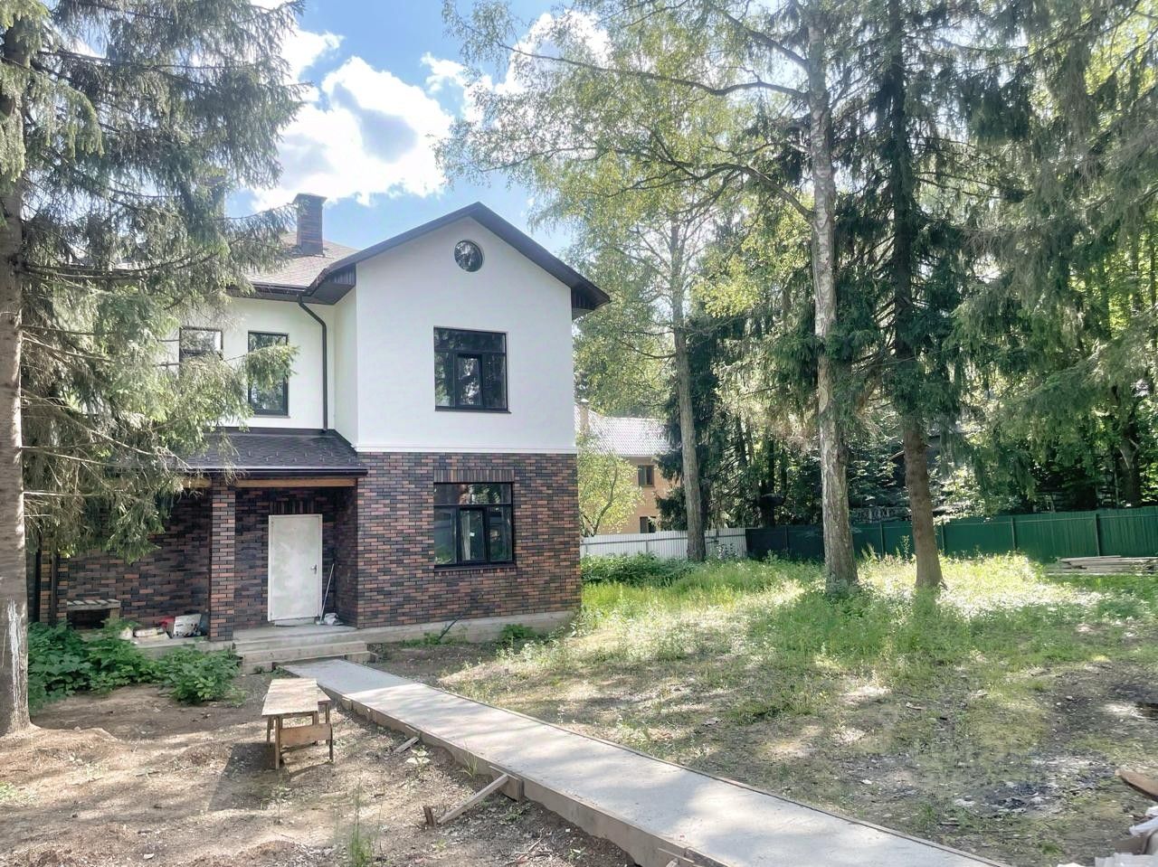Киевское ш., 28 км, г. о. Апрелевка. Коттедж 220 кв. м под финишную отделку в стародачном поселке Фрунзевец (бывшие Генеральские Дачи). Дом 2024 года постройки из кирпича, перекрытия монолит, фундамент лента 1,8 м + монолитная плита. 2 этажа. Высокие потолки, полы стяжка, водяной теплый пол 1 этаж, холл и санузлы 2 этажа. Смонтировано отопление, заведена вода, дом топится. 1 этаж кухня-столовая-гостиная с выходом на патио и на участок, гостевая спальня (или кабинет), гостевой с/у, постирочная. 2 этаж спальня с ванной комнатой, спальня с гардеробной, спальня, с/у. Коммуникации: электричество, газ магистральный, вода скважина, канализация Топас 10 (в процессе установки). Участок 22 сотки под ИЖС, ровный, лесной. На участке вековые сосны, ели, липы и березы.