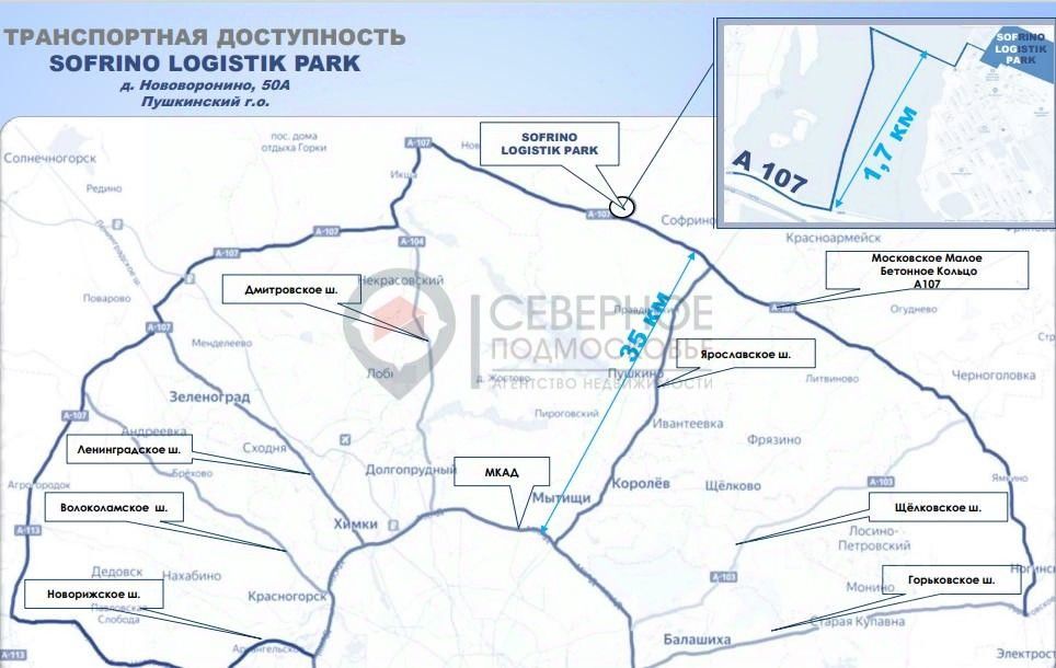 Комплекс находится на территории индустриального парка ''Софрино''. Адрес: М.О., Пушкинский район, д. Софрино. От МКАД 40 км по Ярославскому шоссе. 8 км до выезда на ЦКАД. Съезд на Федеральную трассу А-107. Круглосуточный асфальтовый проезд. Огороженная и охраняемая территории индустриального парка. Видеонаблюдение.