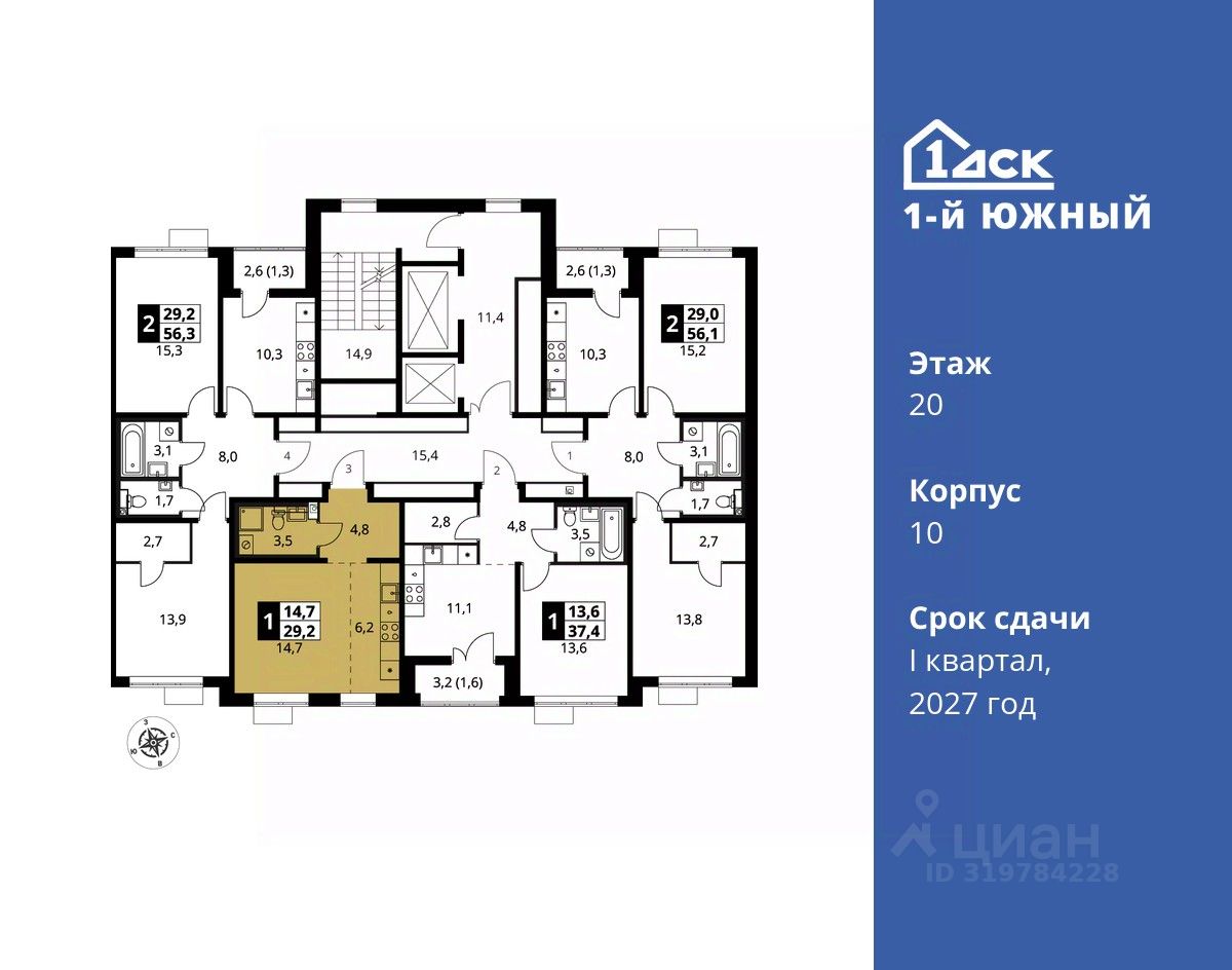 продам 1-к, Первый Южный ЖК, 106 619 523 ₽
