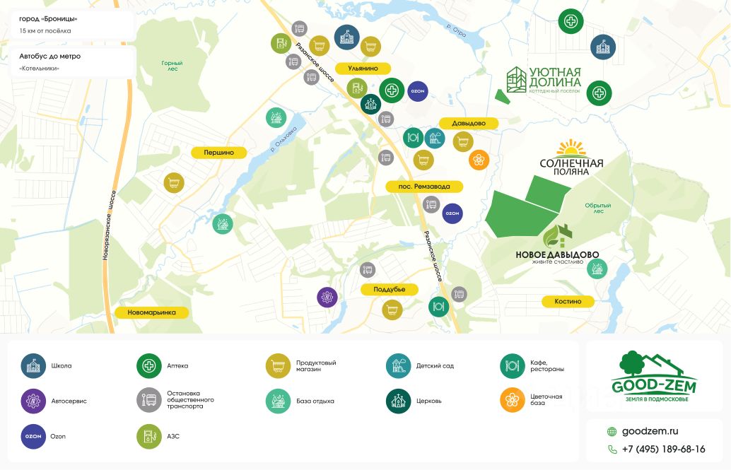50 км от МКАД по Новорязанскому шоссе. Удобный и быстрый выезд из города. Автобус от м. Котельники (остановка Ремзавод). Всегда есть альтернатива машине. Вас ждет комфорт и безопасность 24/7: