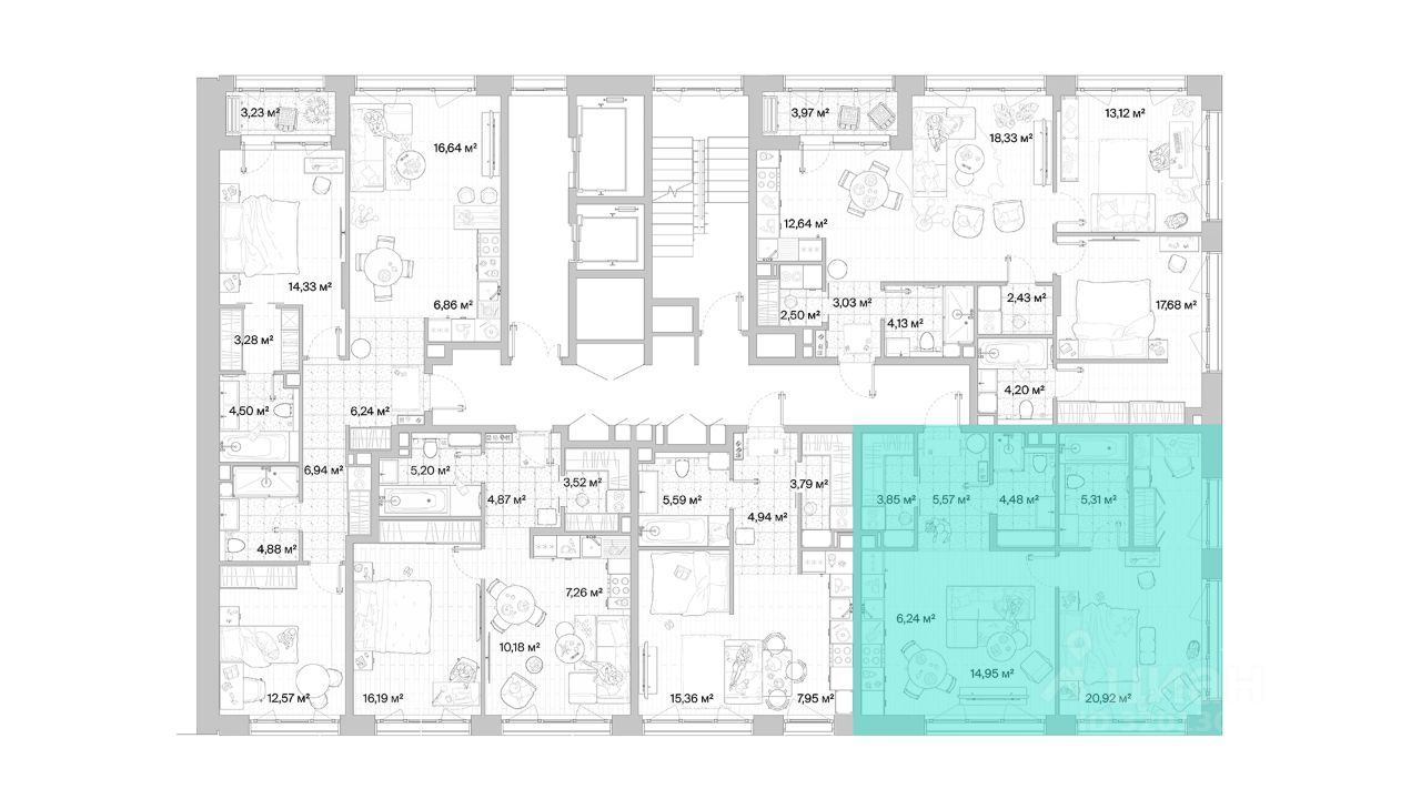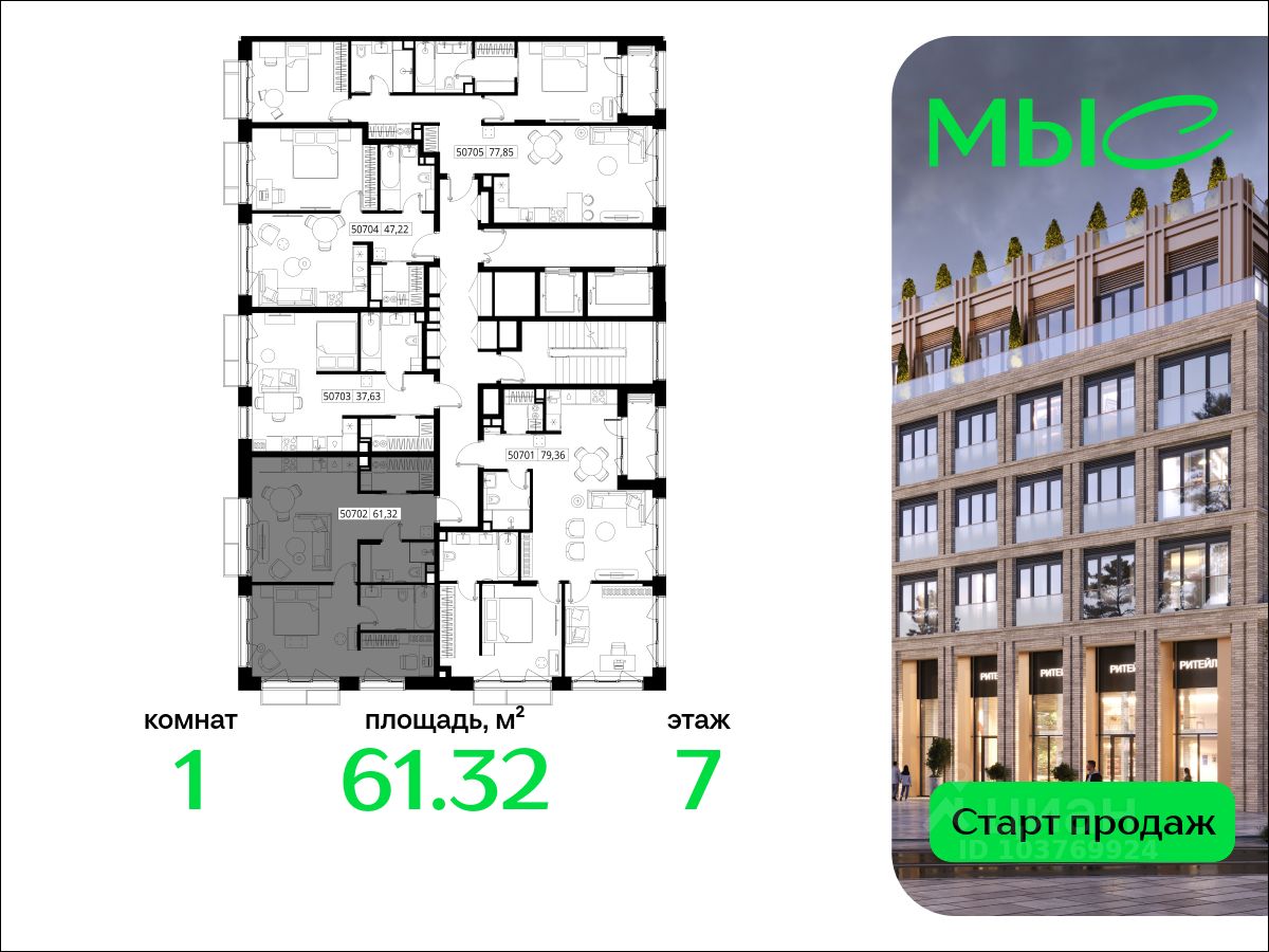 В продаже квартира площадью 61.32 кв. м без отделки на 7 этаже 10 этажного дома. Квартира находится в премиальном жилом комплексе ''МЫС'' (Застройщик - MR Group).
