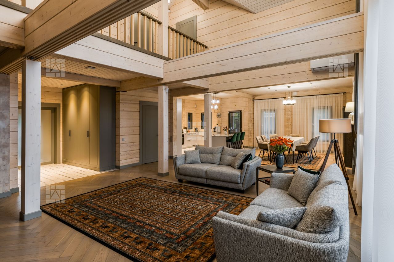 Лот: 69. Эксклюзив! Предлагается невероятно качественный и уютный дом-шале, который строили для себя! Дом выполнен из натурального клееного бруса нестандартного широкого размера 260х240, дом в котором легко дышится, пахнет свежестью и благородным деревом. Дом находится в идеальном состоянии, готовый к незамедлительному проживанию и не требует никаких вложений или переделок. Прекрасная планировка дома была продумана до мелочей, что сделает проживание ещё более комфортным. Более подробно о планировочном решении. На 1-м этаже расположены: кухня-столовая с гостиной (100м), спальня-1 с гардеробной (20м+3м), постирочная (10м), гостевой санузел, банный блок с сауной (20 м), кладовая (10м).