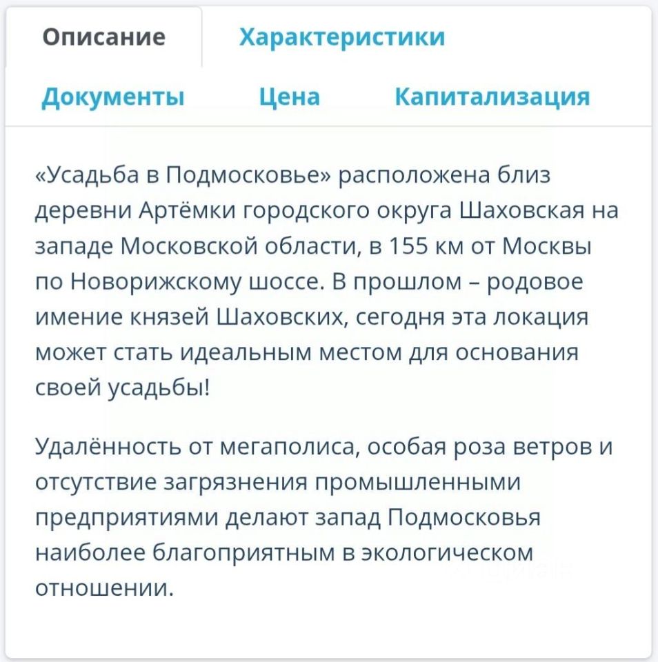 Усадьба в Подмосковье расположена близ деревни Артёмки городского округа Шаховская на западе Московской области, в 155 км от Москвы по Новорижскому шоссе. В прошлом родовое имение князей Шаховских, сегодня эта локация может стать идеальным местом для основания своей усадьбы!