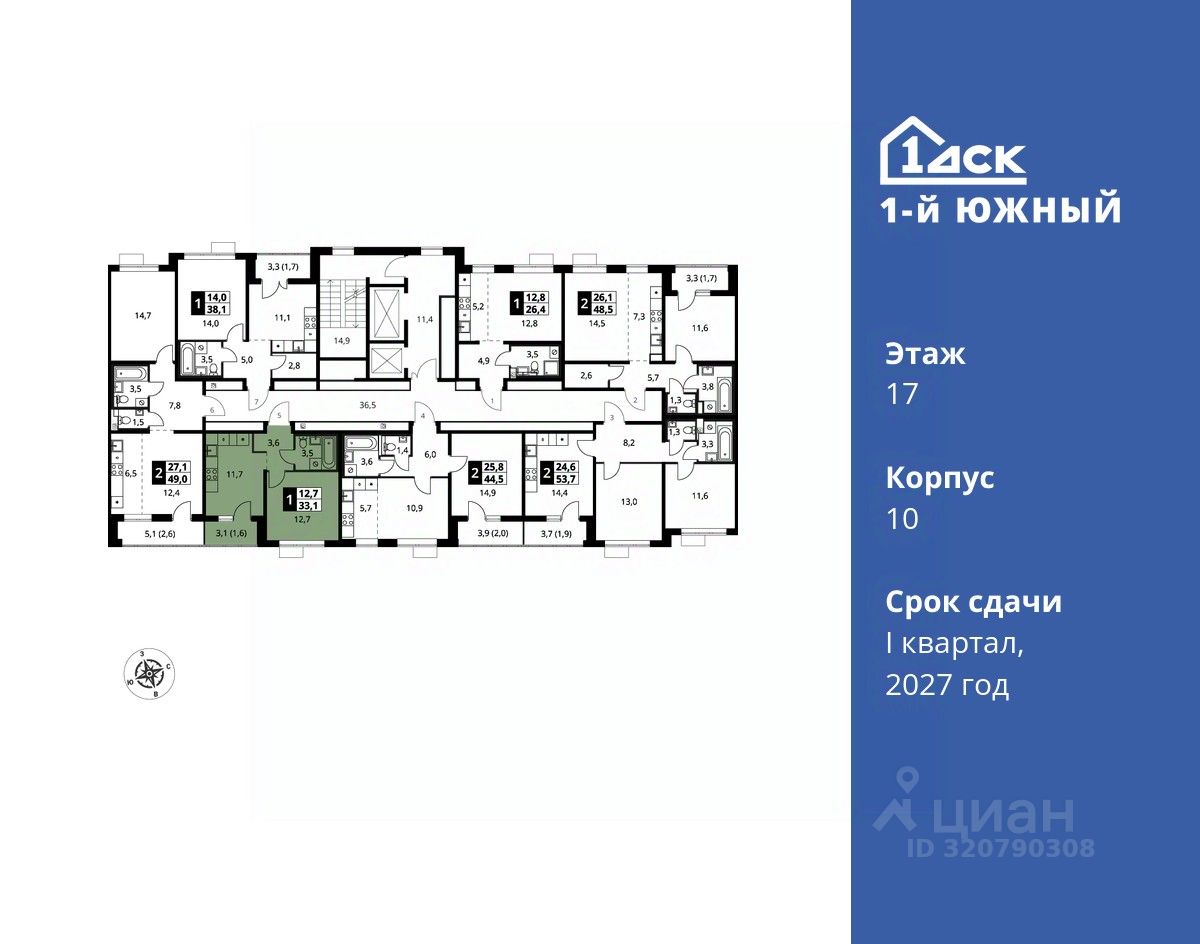 продам 1-к, Первый Южный ЖК, 108 343 385 ₽