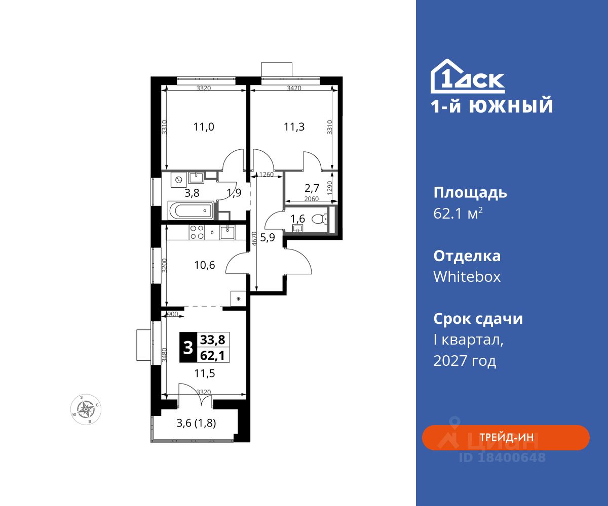 Максимальные скидки при 100% оплате. Trade-in вместо первоначального взноса - выгодно обменяйте вашу квартиру на новую! Прямая продажа от застройщика! Жилой Комплекс класса Комфорт плюс. Продаётся 3-к квартира номер 800 общей площадью 62.1 кв.м на 23-м этаже 24 этажного дома. Отделка Whitebox.