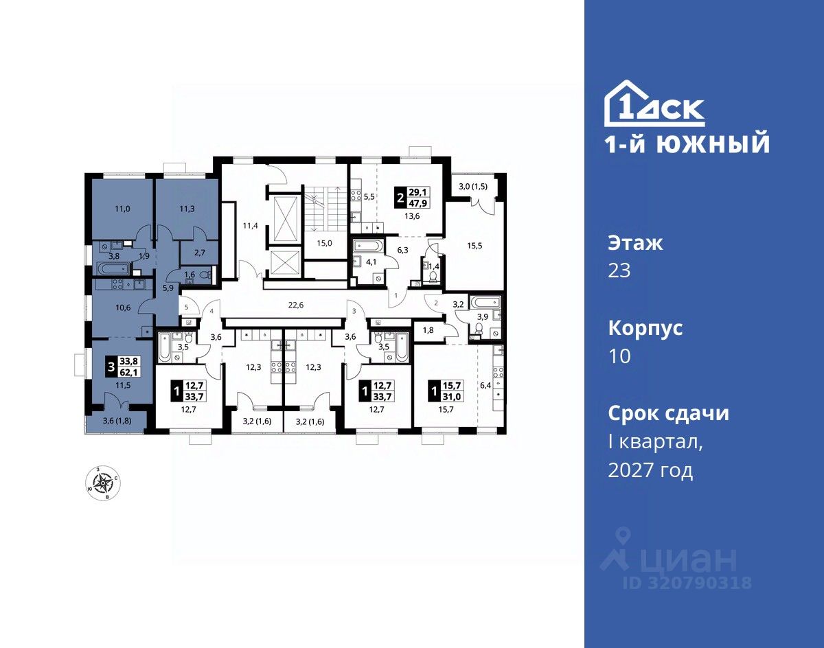 продам 3-к, Первый Южный ЖК, 1012 993 680 ₽