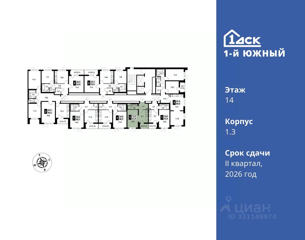 продам 1-к, Первый Южный ЖК, 1.37 851 841 ₽