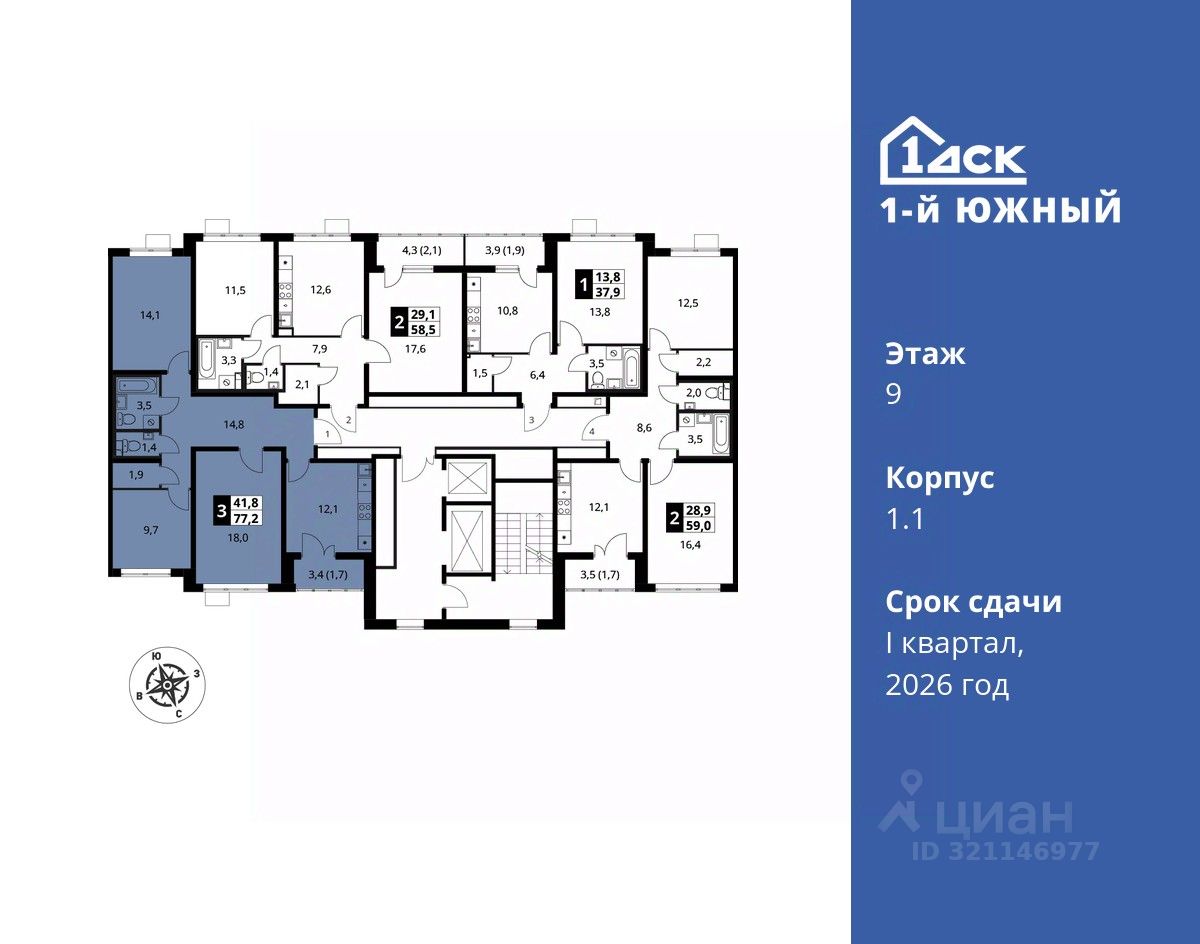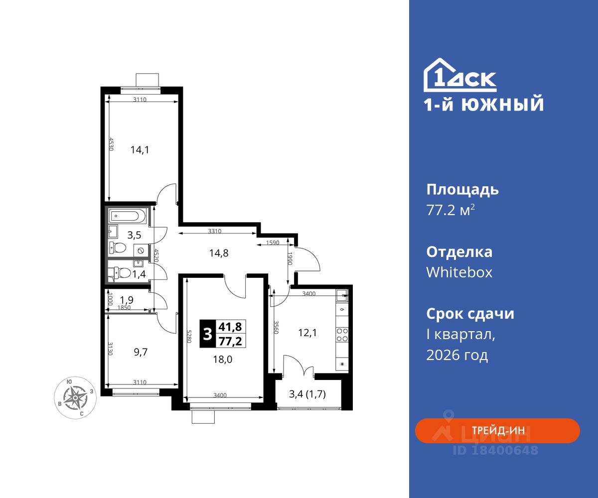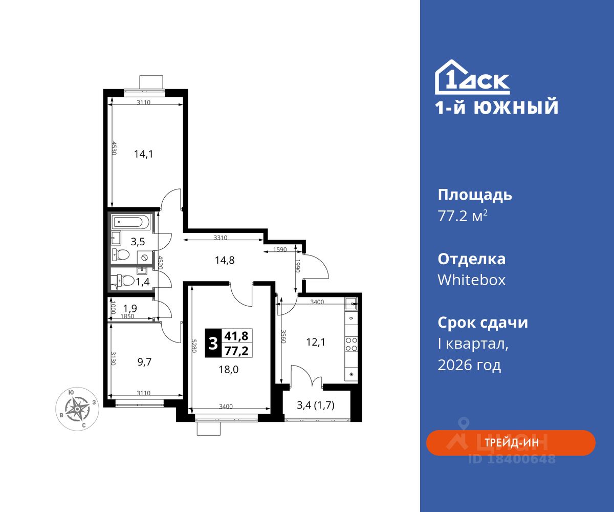 продам 3-к, Первый Южный ЖК, 1.115 801 914 ₽