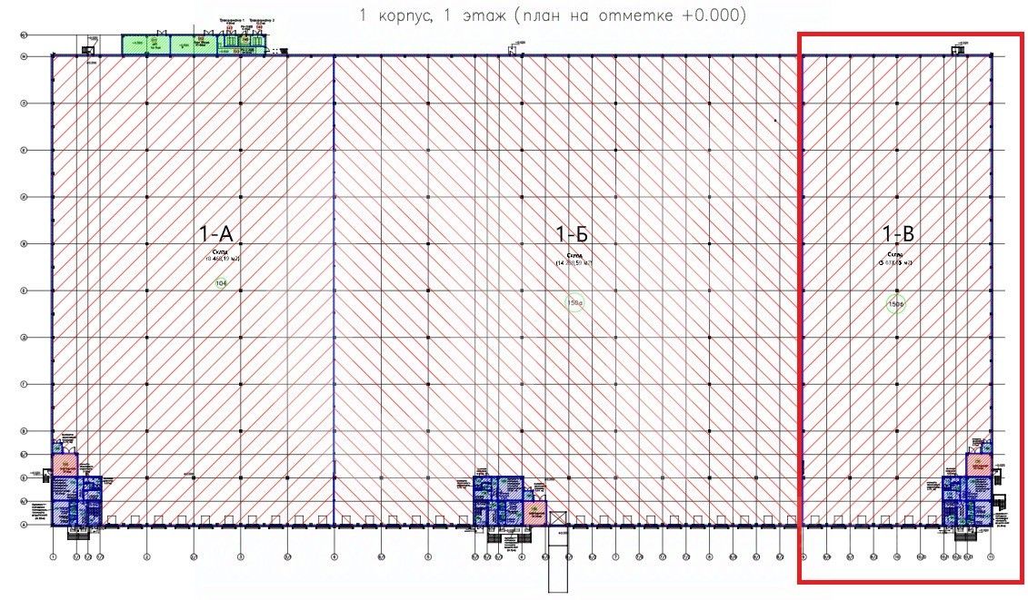 Вся площадь: 6 588.25 кв. м Склад: 5 637.65 кв. м Мезонин: 448.33 кв. м АБК: 502.27 кв. м (на трёх этажах)
