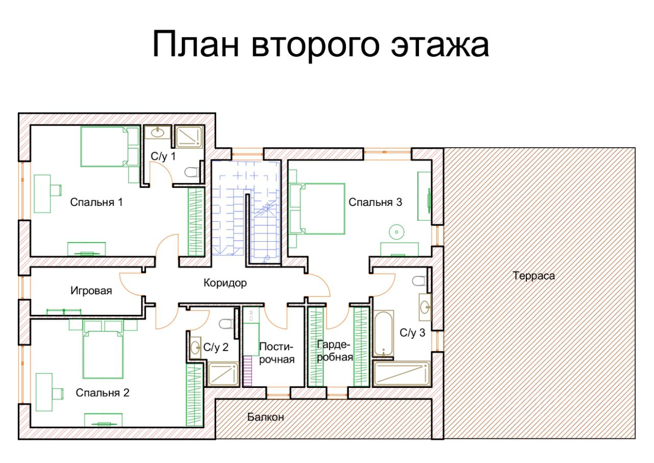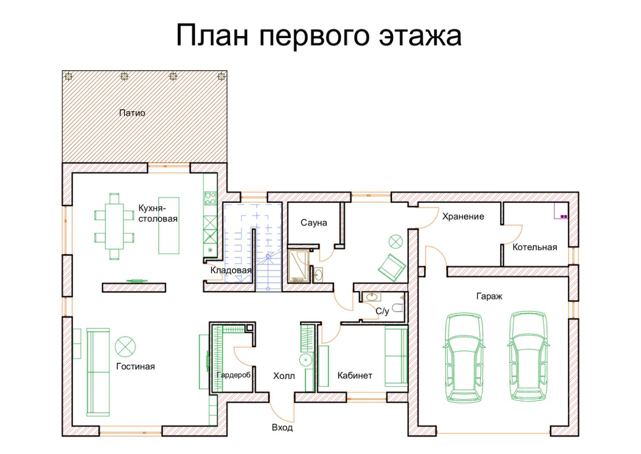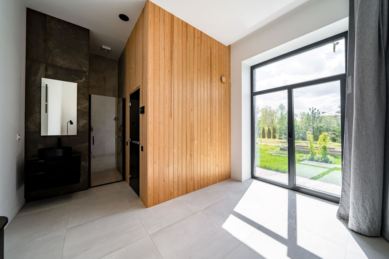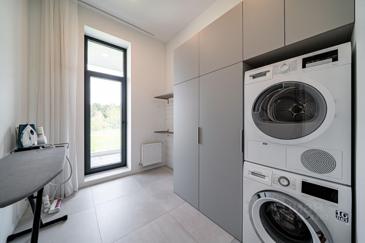 Состав помещений: 1 этаж: прихожая, гардеробная, кухня гостиная, кладовое помещение, спальня, санузел, сауна, котельная, гараж на два авто. 2 этаж: Мастер спальня со своим санузлом, душем и гардеробной (из мастер спальни имеется выход на большую террасу), постирочная, кабинет/игровая, 2 спальни со своими с/у и душем.