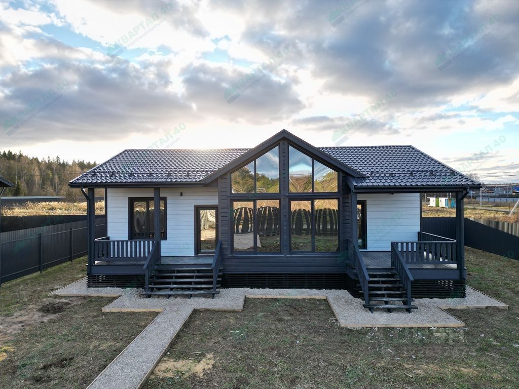 -Характеристики объекта: Площадь участка: 5 соток Площадь дома: 151 кв/м Этажей: 1 Фундамент: ж/б сваи Материал стен: утепленный каркас Отделка наружная: металлический сайдинг Отделка внутренняя: покрашенная имитация бруса Полы: ламинат Крыша: металлочерепица (установлены водостоки и снегозадержатели) Стеклопакеты: поворотно-откидные двухкамерные стеклопакеты Количество с/у: 2 Количество комнат: 3 Терраса(ы): 1