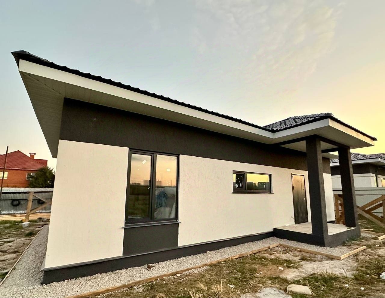 - Материал: дом построен из газоблоков плотностью D500, внутренние перегородки также выполнены из газоблоков. - Утепление: наружные стены утеплены пенопластом толщиной 10 см и облицованы декоративной штукатуркой Короед — долговечное и стильное решение. - Крыша: прочная металлочерепица с утеплением 150 мм. - Фундамент: надёжная монолитная армированная плита марки М300 — дом прослужит вам долгие годы.