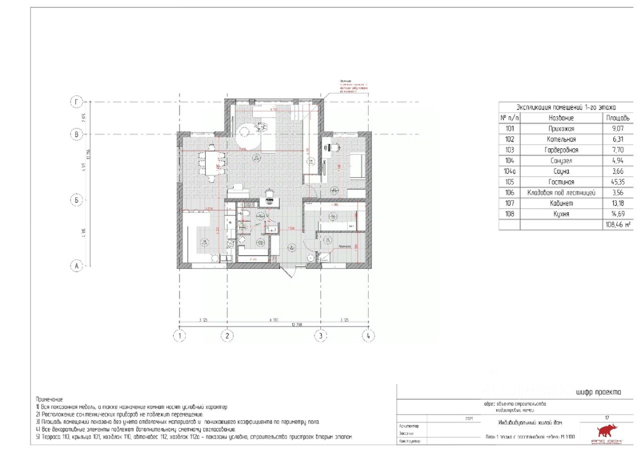 Удобная планировка: Первый этаж: •При входе в дом расположен блок прихожей (9,07 кв. м) с гардеробной (7,7 кв. м), гостевым санузлом (4,94 кв. м) и котельной (6,31 кв. м). В этой части дома также расположена сауна (3,66 кв. м). •Пройдя далее, попадаем в общую зону первого этажа светлую столовую-гостиную (45,35 кв. м). Рядом размещена кухня (14,69 кв. м). •В другом крыле приватной зоне расположена гостевая спальня/кабинет (13.18 кв. м). •Пространство под лестницей практично отдано под кладовую (3,56 кв. м) •Дополнительно на первом этаже возможно обустроить гараж/навес под авто, террасу.