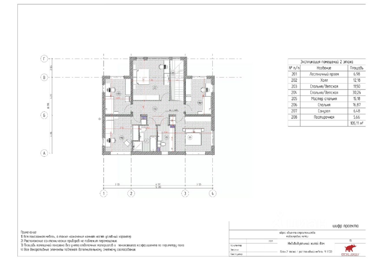 Второй этаж: •Центральное место занимает холл (12,18 кв. м) •На втором этаже предусмотрены два санузла (6,48 и 5,66 кв. м). •И пять изолированных комнат, включая мастер-спальню (от 11,5 до 18,76 кв. м)